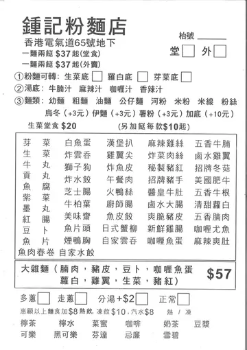 鍾記粉麵店 (天后) 網址: https://s.openrice.com/QrbS0VJi000 地址: 香港天后電氣道65號地舖 電話: +852 34288179