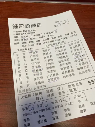 最近見到網上有人推介鍾記粉麵店,決定親身去試下。未行到門口已經聞到陣陣冬菇香,真係令人期待!我叫咗兩碗車仔麵,一碗係米粉底配五香牛腩同牛筋,另一碗就揀咗蘿白底,加咗招牌冬菇、咖喱魷魚同鹵水大腸。值得一讚係佢可以轉菜底,我揀咗蘿白底,份量多到嚇親,粗俗數過有七至八舊!冬菇真係必叫,彈牙又入味;牛腩唔鞋,食落幾有口感;牛筋就有少少漂白水味,略為扣分。至於魷魚雖然有咬口,但味道偏淡;大腸就中規中矩,唔算突出。整體味道還好,價錢合理,但就未至於令人驚喜。