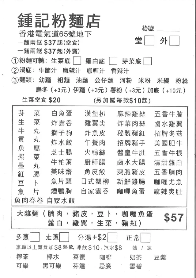 鍾記粉麵店 (天后) 網址: https://s.openrice.com/QrbS0VJi000 地址: 香港天后電氣道65號地舖 電話: +852 34288179