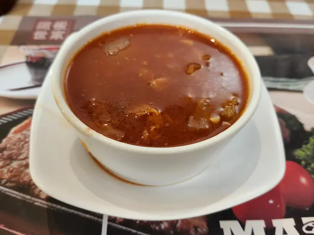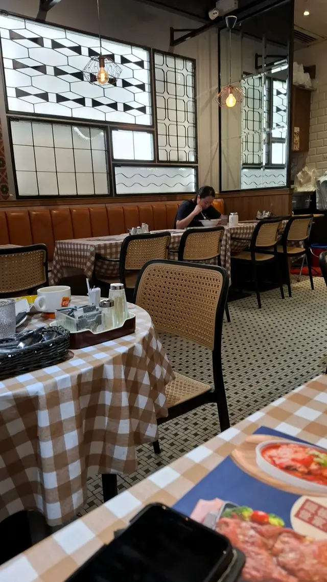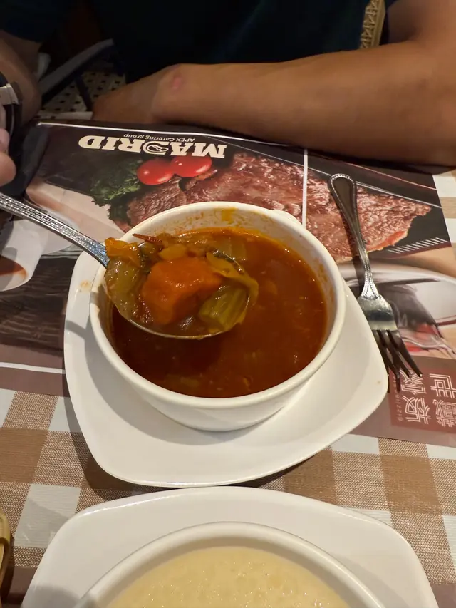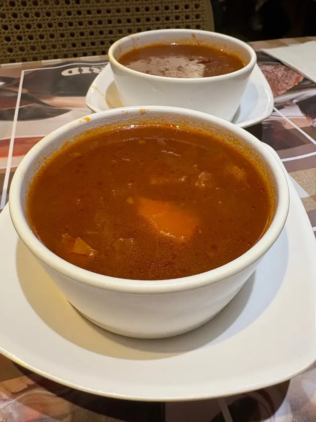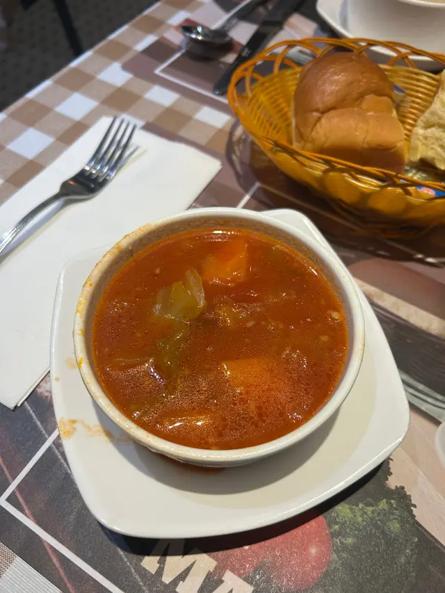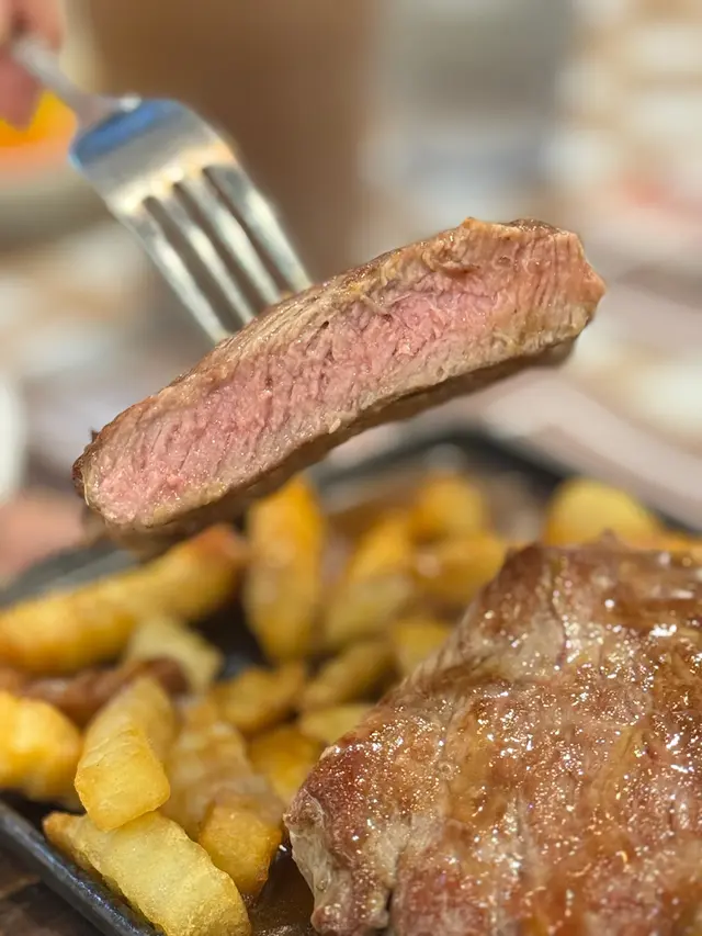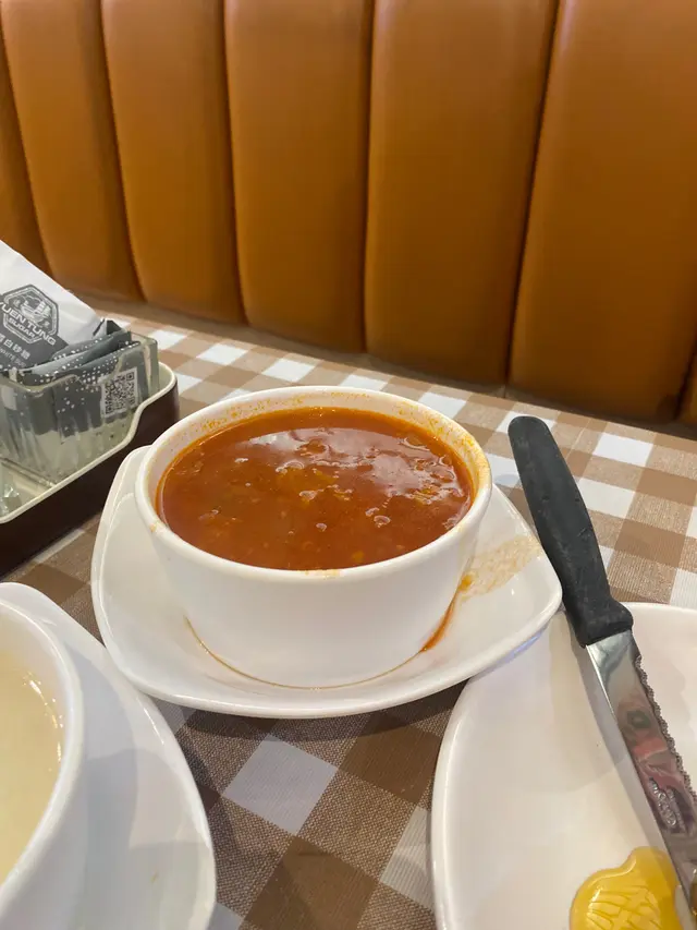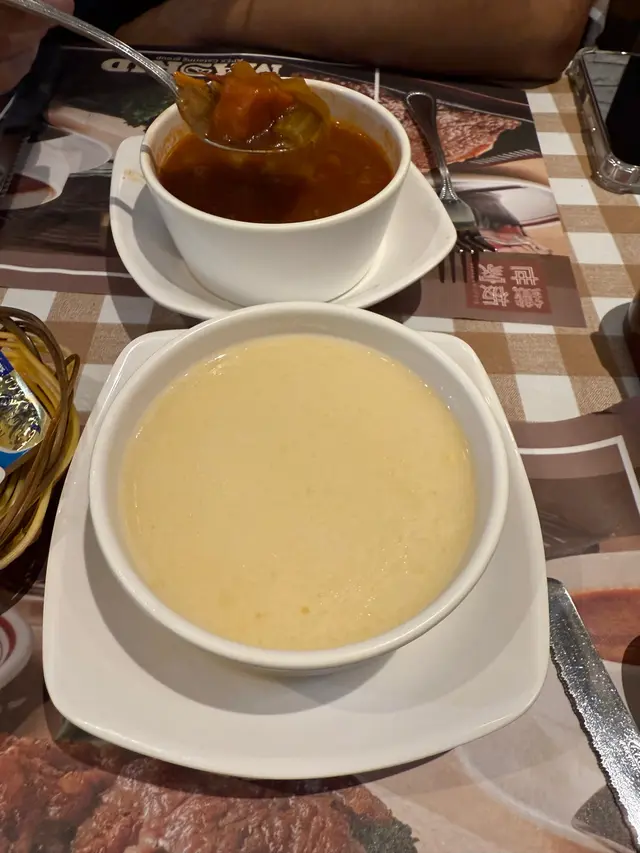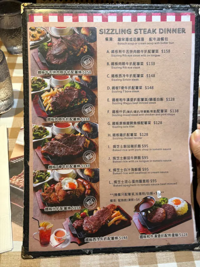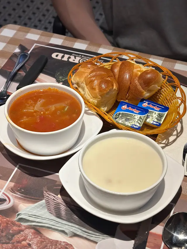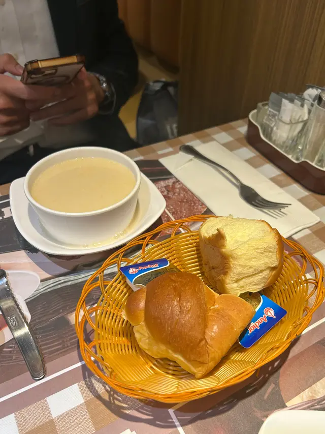 中意膠格仔枱布,好耐無見啦餐湯有紅湯或者白湯,跟餐包牛油除咗塗滿餐包之外記得要加小小入白湯忌廉味會更濃郁~所有扒都跟薯菜,唔係普通薯氣而係波浪粗薯條﹗