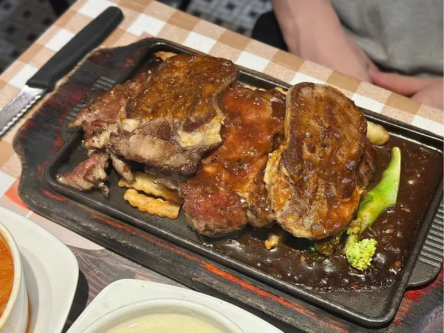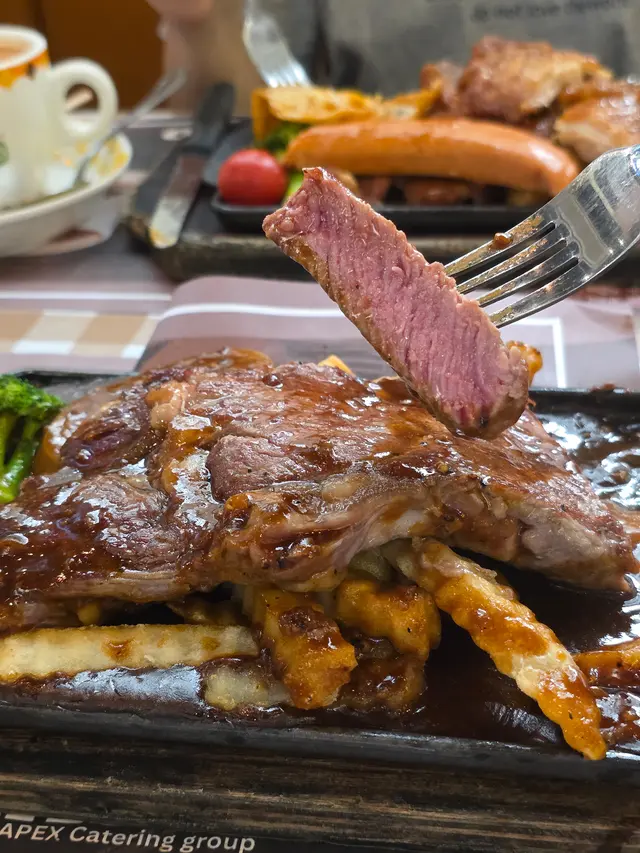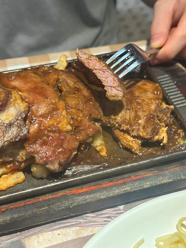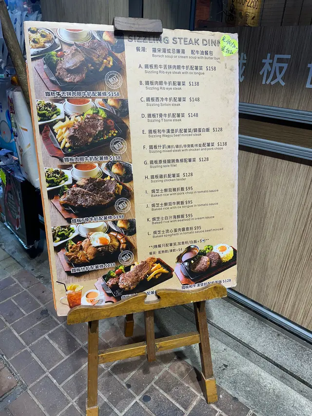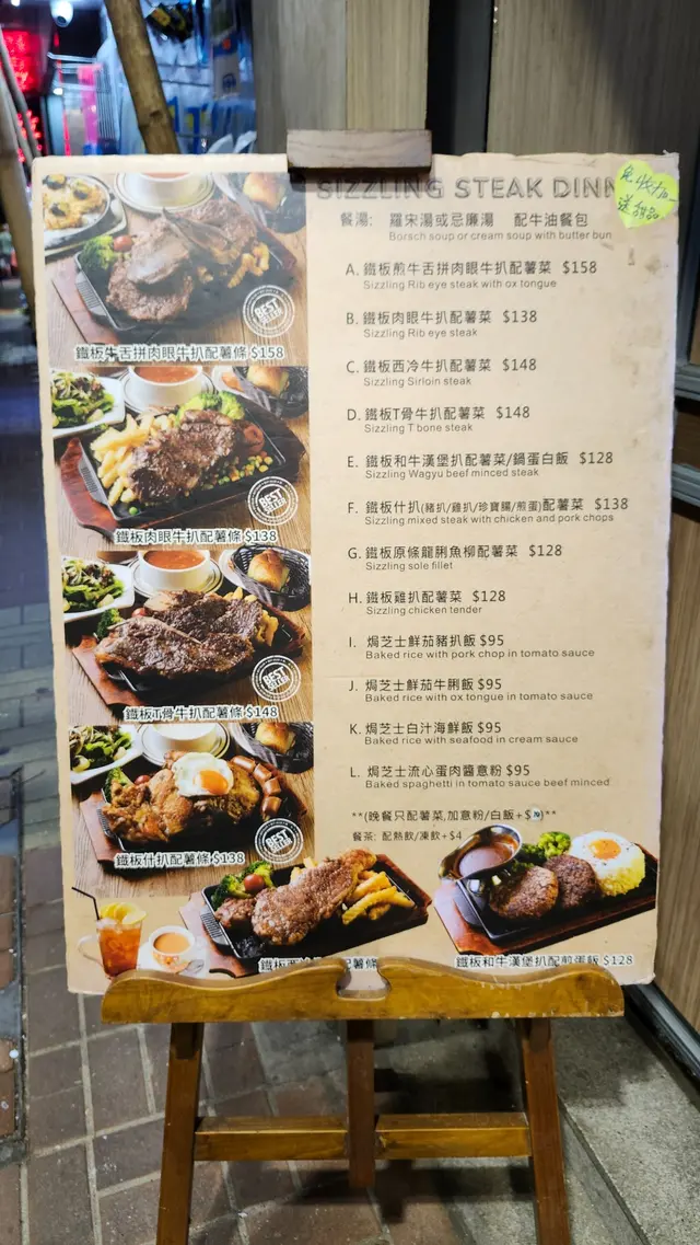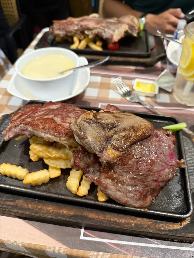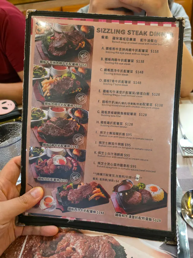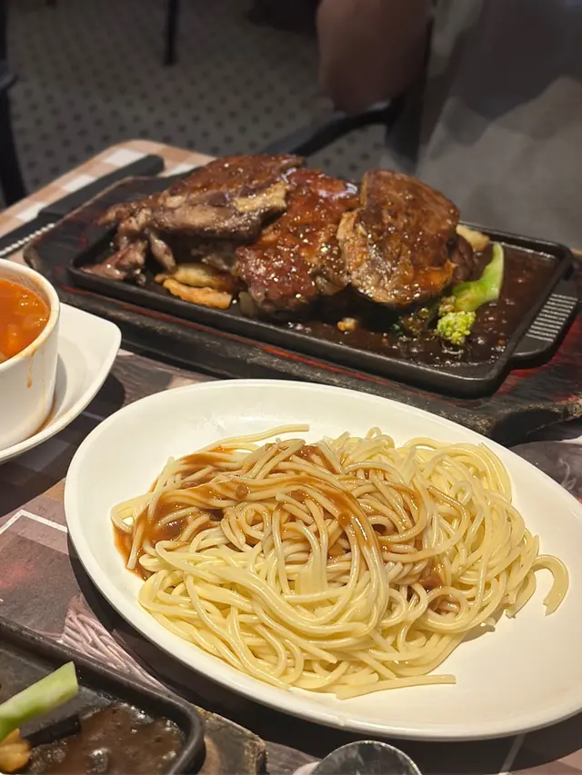意粉都會有額外嘅汁有黑椒或燒汁兩種黑椒夠香口但唔會好辣,怕辣嘅男朋友都食到~鐵板牛舌拼肉眼 $158好吸引嘅組合,一睇menu就比佢吸引
