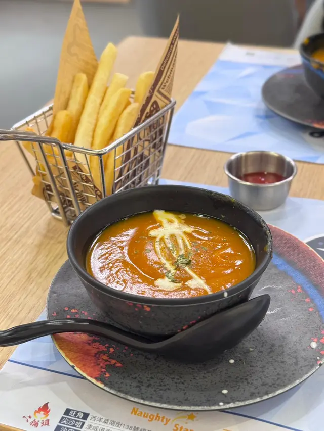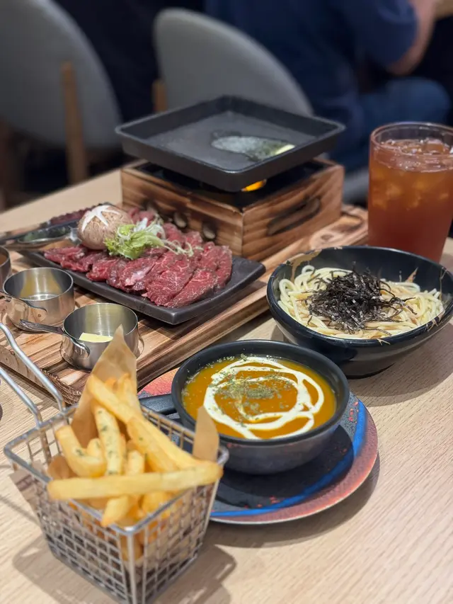 香煎美國安格斯牛板腱扒-套餐首推香煎美國安格斯牛板腱扒套餐,牛扒外層焦香,肉質嫩滑多汁,牛香滲進鐵板底的醬汁裡,拌飯一流。配搭的薯條金黃酥脆,忌廉湯香滑濃郁,每一口都有甜潤味。飲品選了大杯柑桔檸檬鴨屎茶(凍),清新果香中帶點烘焙茶韻,頓時解膩又提神。