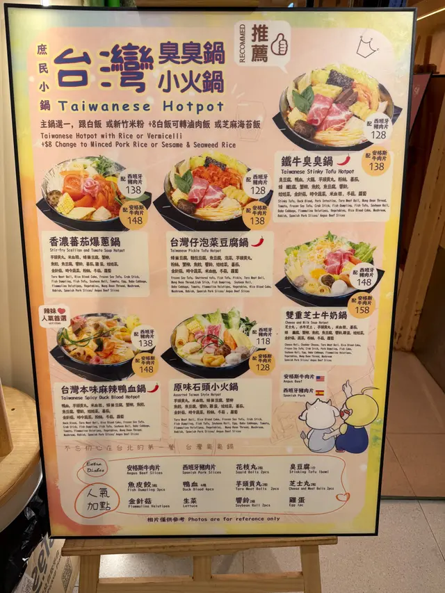 餐廳位置都幾好搵,就係Donki再上少少 🤏平日晚市6、7點時間都仲有唔少吉位(希望大家多多支持香港餐廳 🥹)同朋友睇完餐牌後決定點兩個主食、兩個小食同埋兩個嘢飲 🍱我就點左個鐵牛臭臭鍋(微辣)配牛肉同埋米粉幾貼心既係店員比左個bib我食臭臭鍋 😂真係開正我果範,因為我係經常食嘢整污糟衫既人 😝臭臭鍋裡面有好多料:豆腐、響鈴、肉、菜、米血糕、粉絲,份量都唔少,食到好飽!微辣黎講都唔算辣,鍾意食辣既可以叫高level啲既辣度 朋友叫左柚子蜜香雞排便當個樣都十分唔錯 👍 飯係滷肉飯,絕對無hea雞排煎得香脆熱辣,蘸上柚子蜜清新開胃 🤤even連旁邊既小碟都幾好食小香腸同埋鹽酥小拼盤小香腸好貼心地已經精準舖好生蒜 🧄台灣小香腸黎講一定要夾生蒜先好味!😋而鹽酥拼盤裡面係花枝丸、雞塊同埋甘薯條 🍠香口野失誤率低,唔係話特別亮眼但係一定係穩打穩紮紅豆珍珠奶茶🫘 同埋香濃巧克力🍫兩杯都好好味👍 尤其是紅豆珍珠奶茶裡面有好多起沙紅豆,珍珠香糯QQ以呢度唔係好多食客黎講,坐既環境一流,方便朋友傾計!…查看更多
