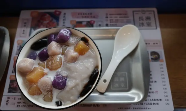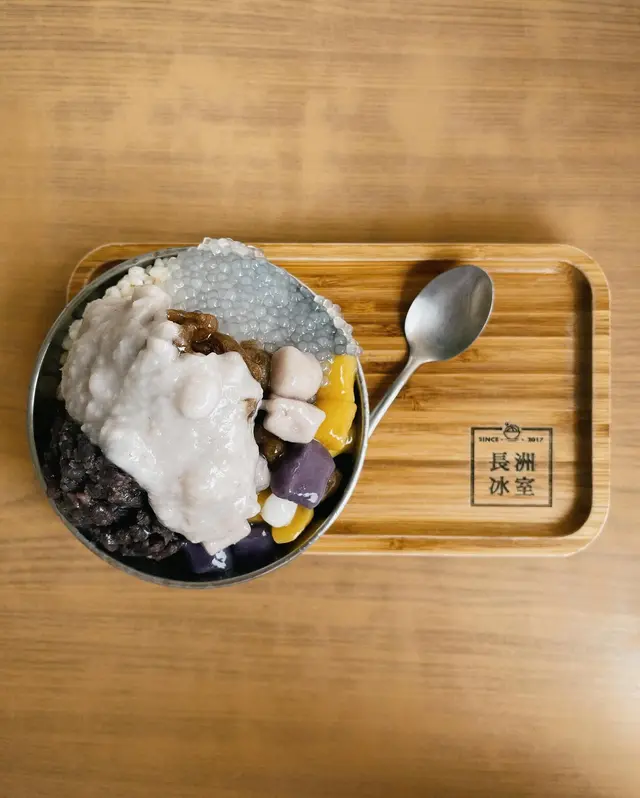 長洲冰室以自家冰品及多元化的配搭作主打,首次光顧可以選擇集大成的仙草黑糖三色圓剉冰。濃郁的黑糖冰上鋪滿多款配料,包括嫩滑仙草、煙韌三色圓、芋泥、紅豆及西米,口感豐富,消暑一流。Cheung Chau Bing Sutt specializes in shaved dice with diversified topping. The classic assorted shaved ice features grass jelly, taro balls, mashed taro paste, red beans and sago.查看更多