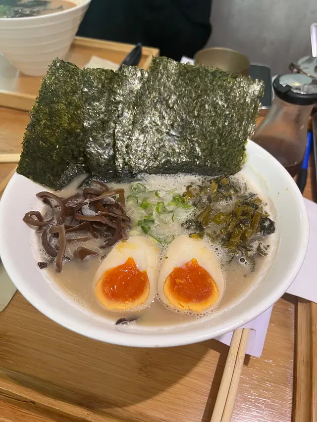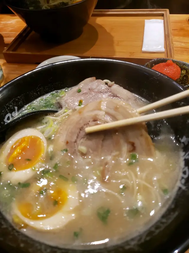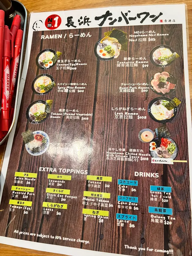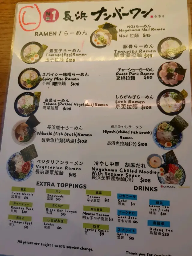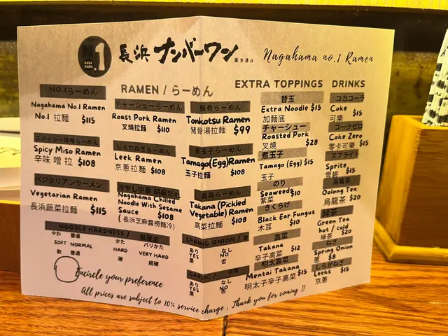 這家位於中環九如坊的拉麵店「長浜No. 1拉麵店」,以簡約的日式風格呈現,主打特色拉麵。這次品嚐了三款拉麵: 辛辣味噌拉麵($108)湯底濃郁帶微辣,味噌香氣突出,麵條勁道足,略嫌湯底太辣,適合重口味愛好者;No.1 HOUSE RAMEN($115)作為招牌,湯頭醇厚但不膩但有咸,叉燒軟嫩,肉片份量偏多,溏心蛋火候恰到好處; 魚湯冷凍拉麵($108)則以清爽取勝,柚子香氣清新,搭配薄切肉片,適合偏好淡雅的食客。天氣熱,十分推薦。整體而言,湯底與麵質表現一般,配料選擇較傳統,驚喜感稍缺。服務費10%合理,人均約$120,在中環屬中高價位。若追求地道日式拉麵且預算充足,值得一試,但性價比略遜於同區其他選擇。…查看更多