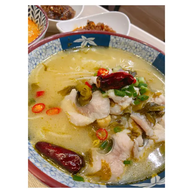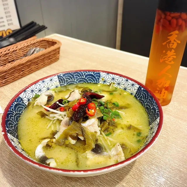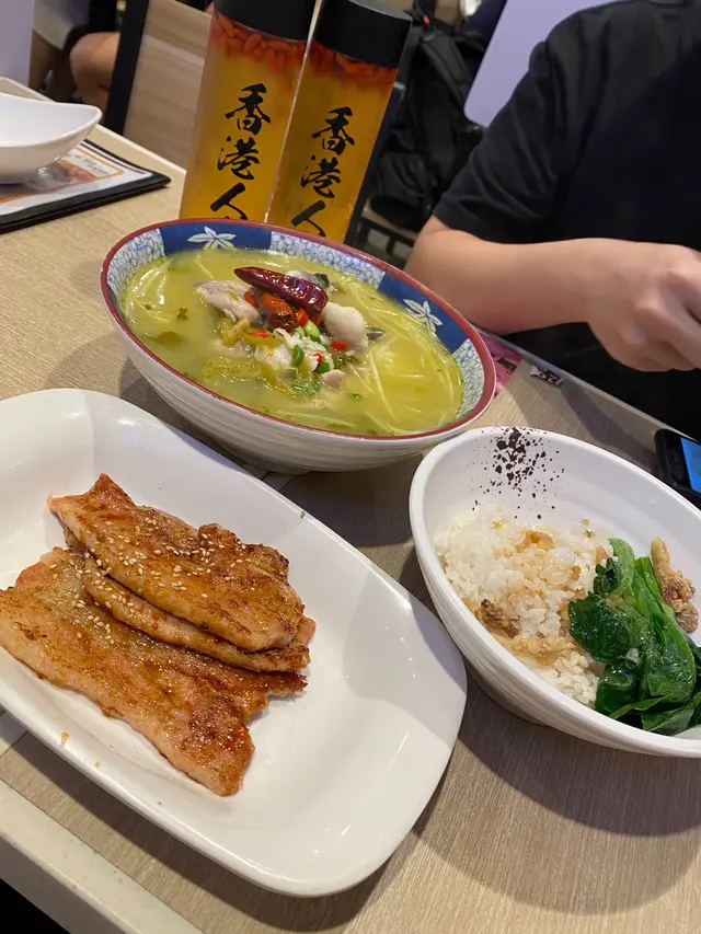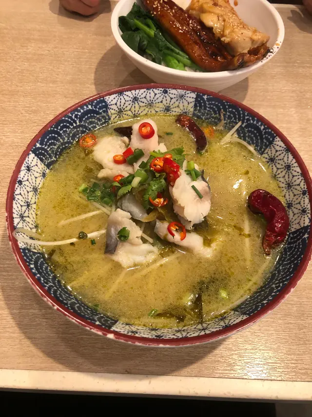 同朋友去食飯,食咗個酸菜魚片湯河,味道還可以,辣度一粒星,魚片夠滑冇骨碎,數量5-6塊,唔算多,中規中矩。配菜嘅芽菜較少,如果多d較爽口。重點酸菜唔酸,少同碎,湯有鹹香味嘅,但冇咗酸菜魚個酸菜靈魂係爭咗d,如果可以再酸好多,相信味道更加突出,更加好食,酸菜都要多,冇酸菜突出唔到酸菜魚精髓。酸菜魚要酸辣鹹先最好,依家得鹹同辣,冇咗酸。少少鹹少少辣多多酸先係最好食嘅酸菜魚片!最後,河粉浸得太耐,散曬,要用粗河粉煮先好食,會索曬湯嘅精華,又好食又有咬口,咁就最完美。飲品得返牛蒡茶,雖然失望,但還好。查看更多