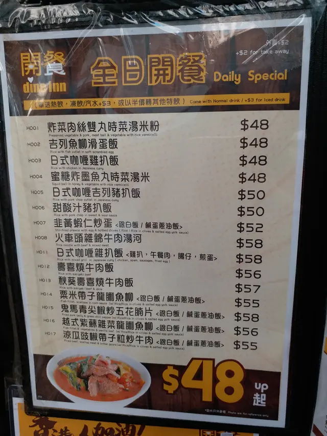 之前book咗望月喺前日(11-9-2021 Sat)去旺角攞月餅,咁橫豎出嚟,就去鈺華堂(https://www.openrice.com/zh/hongkong/r-%E9%88%BA%E8%8F%AF%E5%A0%82%E5%B0%8F%E9%A3%9F-%E6%97%BA%E8%A7%92-%E6%B8%AF%E5%BC%8F-r720826)食個晏啦,我哋去到,點知原來呢間冇堂食,疫情下,老公唔想企喺喥食,於是臨時轉搵第二間,上嚟search我收藏嘅餐廳,搵到女人街有一日三餐,但要行到去登打士街嗰頭,照去啦.但原來都有呢間喺對面,我哋行嚟時,又見到後生仔海南雞1998(https://www.openrice.com/zh/hongkong/restaurants?what=%E5%BE%8C%E7%94%9F%E4%BB%94%E6%B5%B7%E5%8D%97%E9%9B%9E),但老公又唔想只食雞,而呢間又冇人等位,就呢間啦.不過原來我哋入到去填表,男店員問係咪兩位?我答係,佢話俾張飛我哋先,啊,原來啱啱冇晒位嘅,咁我哋出去等,待嘅時候睇埋menu,老公睇到有鹹蛋黃醬香蔥油撈飯,好邪惡啫.我哋等咗4分鐘左右就有位.坐低後再睇menu,決定要:2. 跟餐加$10.00嘅養生牛蒡冷泡茶一樽仔上嘅,味道有啲甘,解渴都一流.味道:3分4. 都係跟餐加$10.00嘅解毒胎菊花蜂蜜菊花味濃淡適中,都幾甜,蜂蜜可以減返少少.味道:3分3. C301,$62.00嘅五大素球配懷舊豬油渣撈飯顧名思義就係5粒素丸,嚟到睇到有啲汁同苦瓜喺底,飯都有啲菜心,我食吓素球先,用嘅係菇同唔知咩植物做成,味道OK嘅,佢嘅汁係酸甜汁,配搭唔錯.味道:4分懷舊豬油渣撈飯,睇見豬油唔多,食吓,都冇乜特別.味道:3分1. H014,$55.00嘅粟米帶子龍脷柳鹹蛋黃蔥油飯呢個比較耐到,睇見鹹蛋醬,油份好夠,味道唔太濃,甜豉油落得好夠.味道:3.5分粟米帶子龍脷柳呢?帶子9大粒,炸過嘅龍脷柳有4年,外脆內滑又唔鯹,OK嘅.味道:3.5分服務:好有禮貌.抵食係2.7分查看更多