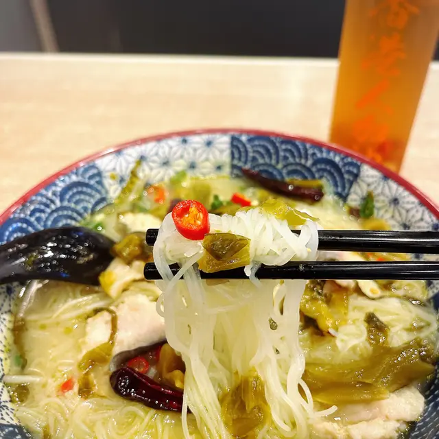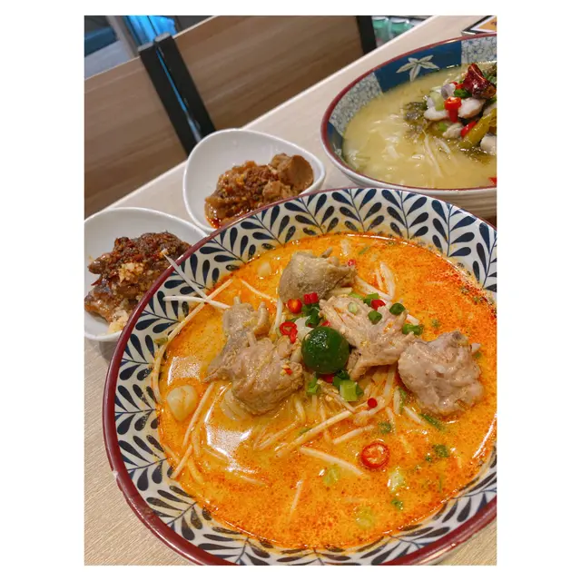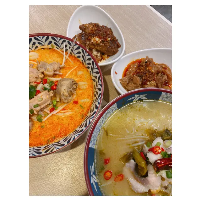 一直都好想試佢地個酸菜魚片湯麵夜晚經過旺角食飯時間竟然見到唔洗排隊諗住試一試叫左個酸菜魚片線米線($57)跟餐加配左麻辣豬軟骨($28)·一上枱就試左個湯先個酸菜量係毫不手軟個酸味係幾好但辣味感覺完全失左蹤變左好單一既酸味最後要自己加辣油魚片係普通魚片唔算滑而有且少量魚刺🥲成碗麵有少少失望喇沙雞球帶子湯米線($58)加配麻辣牛筋腩($28)喇沙湯度反而比較出色唔會太椰味而雞球係嫩滑但帶骨有骨個感覺差左少少至少帶子佢係細細粒果種珍珠帶子份量唔多且無咩口感反而兩個小食都有驚喜個麻辣味幾香幾惹味豬軟骨都有兩大件好入味而腍身牛筋腩軟腍得黎帶少少煙韌唔會淋啤啤咁整體而言價錢合理小食比湯麵出色但酸菜魚片真係幾失望🥲查看更多