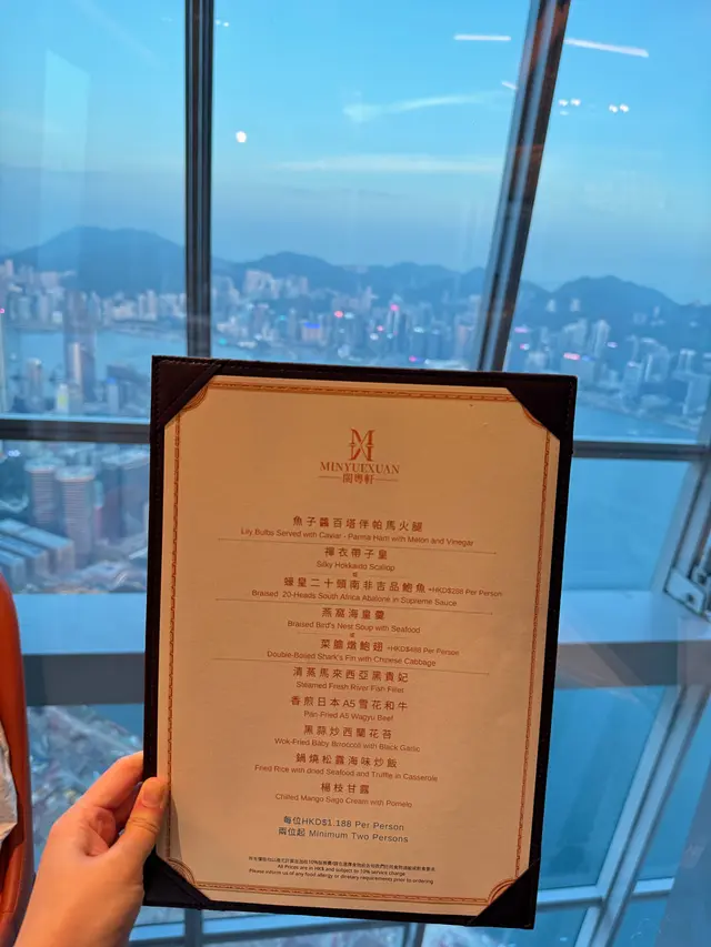 位於ICC 101樓,完美飽覽維港景色,加上裝潢優雅,淨係環境已經贏晒。而食物嘅質素一樣令人印象深刻,絕對高質。先來兩款精緻開胃前菜 - 椒香脆芥蘭芯 及 頭抽芥末伴海螺片。前者將爽脆芥蘭心切成細片,配上魚子醬,味道帶椒麻香;後者以鹹鮮頭抽及微辣芥末調味海螺片,味道鮮香。再來禪衣帶子皇,以薄脆禪衣包住珍寶帶子,賣相滿分,食之前淋上配上酸甜醬汁,令鮮嫩帶子皇味道更出色。荔浦黃金匣絕對印象深刻。酥脆外層裡面包住綿滑芋頭蓉,外酥內嫩。加淋上秘製豬頭肉黑松露醬汁,美味非常,難怪成為得獎菜式。主菜大紅袍乳鴿同星加坡胡椒蟹亦非常高水準。前者應該係我食過最皮脆肉嫩嘅乳鴿,沒有之一。而且以大紅袍香清雅香搭配乳鴿香,意想不到地配合;胡椒蟹絕對啱哂喜歡濃味人士,辛、辣、胡椒香,完全滲入蟹肉!鮑魚肉絲炒麵球,每個脆炸炒麵球上都有一隻肥美鮑魚,食之前可選擇淋上肉絲芡汁。最後來一碗荔枝石榴露,酸酸甜甜,入面仲有果肉,大滿足。…查看更多