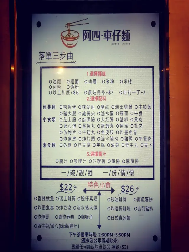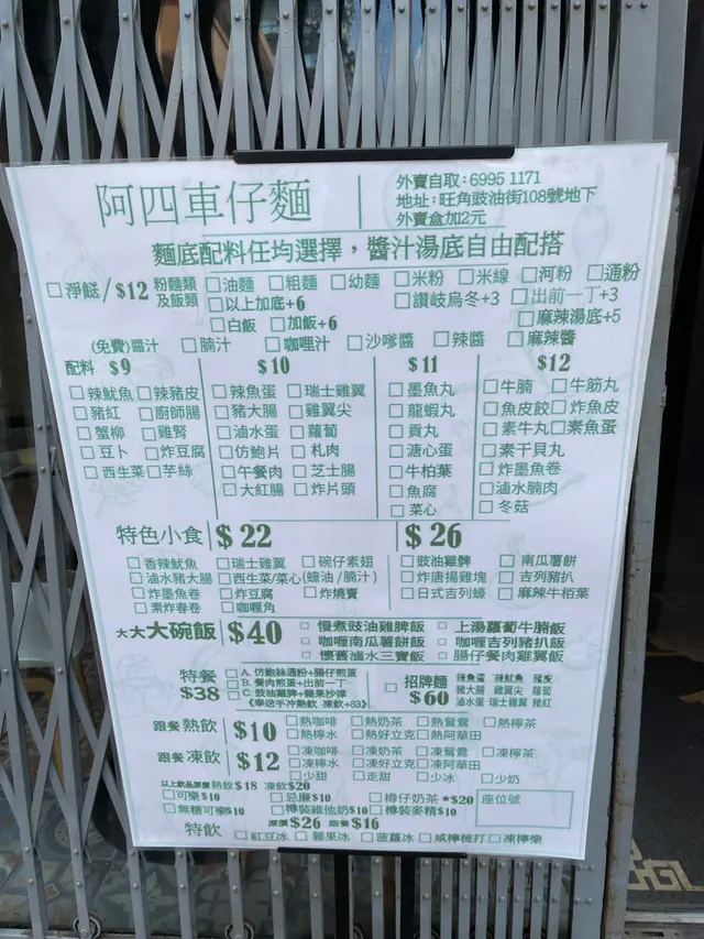 我同朋友去開旺角,咁啱我哋又未食嘢,我哋就喺OpenRice度search車仔麵,見到呢一間嚟我哋幾近,所以就去咗呢一間到食。🤧🤧------------------------------咁啱撞正下午茶,嗌三個餸連一個麵只係30幾蚊,我就嗌咗炸墨魚卷、豬紅、蘿蔔、瑞士雞翼同埋米粉。而我朋友就嗌左牛腩、豬大腸、蘿蔔同埋粗麵。醬汁方面我揀咗麻辣醬,朋友就揀咗沙嗲醬。餸方面,豬紅冇乜味,蘿蔔都幾甜,瑞士雞翼就幾入味。但個麻辣醬汁好辣,辣到我要用我朋友個碗沙嗲湯去沖一沖🤧🤧,但都幾好食嘅。而我朋友就覺得不過不失。但我覺得份量都唔算少。------------------------------咁啱經過又諗唔到食啲咩嘅話都可以去食吓。…查看更多