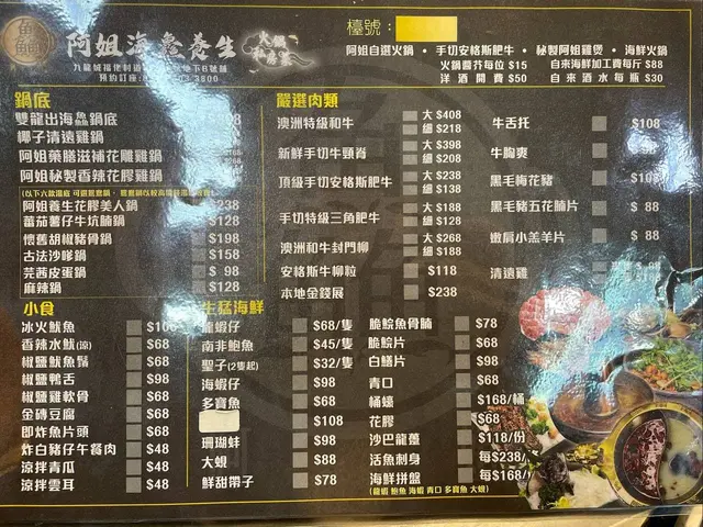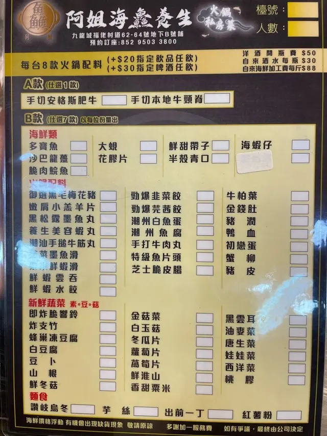 阿姐海鱻養生火鍋私房菜 (九龍城) 網址: https://s.openrice.com/QrbS0shmA00 地址: 香港九龍城福佬村道62-64號福聯大樓地下B號舖 電話: +852 95033800