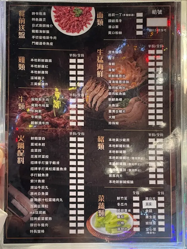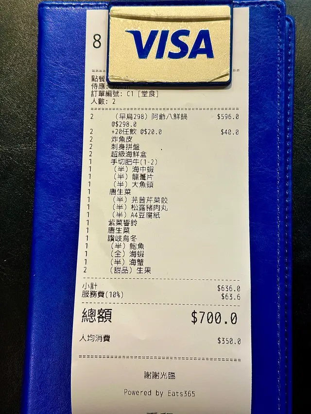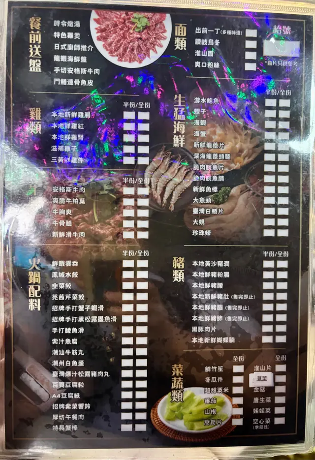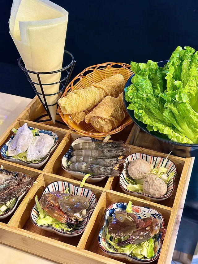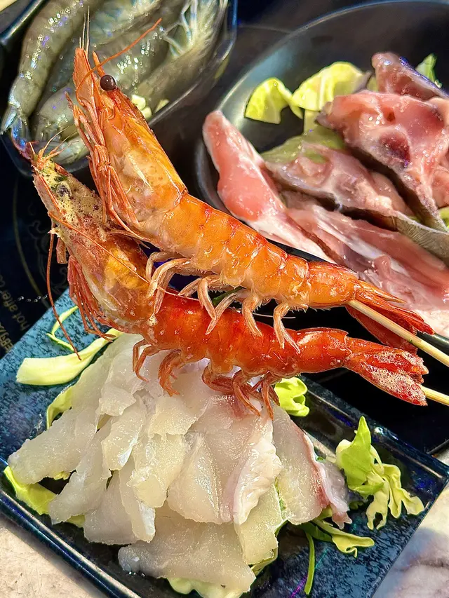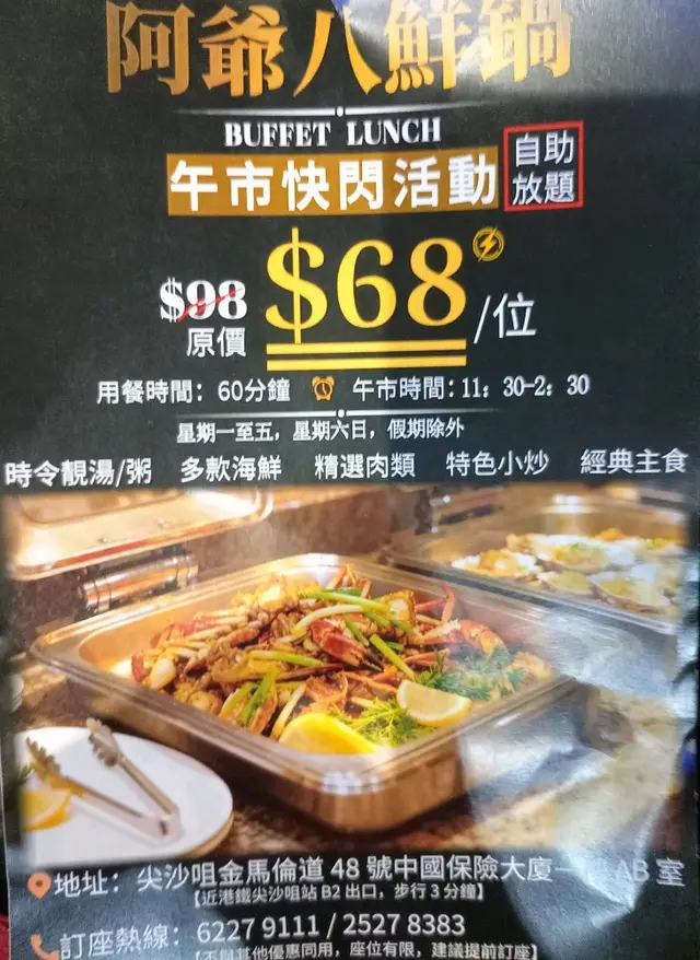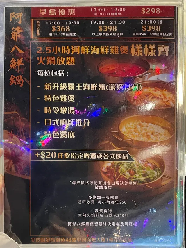 今天和朋友去吃「阿爺八鮮鍋」。早年在旺角吃過,知道其海鮮有一定水準。職員告訴我們七點前離座價錢更抵,所以今天我們享受了一餐極豐富的「早鳥」海鮮盛宴。時令燉湯:龍骨石斛湯用特色茶壺盛着,燉湯湯色清澈卻滋味濃郁,入口清甜滋潤,毫無味精感,比家常老火湯更見真章。芝士雞煲芝士雞煲的芝士香濃幼滑,雞肉香氣十足,肉質嫩滑不柴。雞肉蘸滿芝士,熱騰騰的同吃,十分惹味。🦞霸王海鮮盤• 膏蟹:膏很香,蟹肉鮮甜飽滿。• 龍蝦:鉗肉厚實如元貝,肉身爽彈,• 鮑魚:肉質結實,十分新鮮。• 大蝦:蝦肉緊實,如現撈一樣!• 扇貝:貝柱透亮,蒸煮後滲出天然海水甜味。海鮮處理極見功夫,既保留原鮮又不過鹹,讚!🐟日式刺身拼盤赤蝦:晶瑩剔透,爽脆!吞拿魚蓉:與蔥花很搭,融化時爆發油脂香。油甘魚:霜降紋理清晰,入口即化章魚:彈牙程度堪比手打丸類帶子:煙韌中帶糯感赤貝:爽口彈牙🥩安格斯牛肉雪花分佈如大理石紋,輕涮三秒即捲成玫瑰狀,牛脂香氣與肉汁溢滿!🔥其他火鍋食材珍珠蠔:圓潤如拇指蓋,一咬爆出奶油質蠔汁。蟶子:展開如手掌大,脆度堪比新鮮竹笙。招牌手打牌子蝦滑:蝦粒占比高達八成,真材實料。深海龍躉頭腩:魚肉透光,爽脆似蒟蒻卻帶魚鮮。大蜆:好大隻,很清甜。整體而言,以放題價位能吃新鮮海鮮與燉湯,從雞煲的濃郁到海鮮的清甜,味覺旅程層次分明。…查看更多