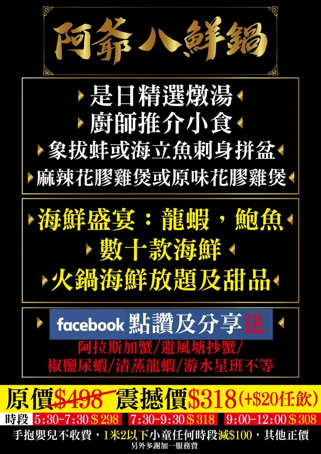 阿爺八鮮鍋 (旺角) 網址: https://s.openrice.com/QrbS0goW900 地址: 香港旺角登打士街43H號登打士廣場3樓 電話: +852 25278383