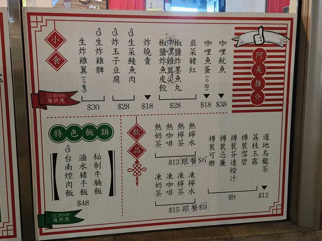 呢個long weekend 我哋兩公婆去周圍行吓搵野食我哋呢日去左大角嘴嘅阿美車仔麵車仔麵具香港本土特色,是經典的經濟實惠的本地平民美食,各區都有不少高質車仔麵小店。餐牌除咗有車仔麵之外,仲有飯類我哋叫咗一個飯、一個車仔麵share, 作為呢日嘅午餐呢度有不同種類的麵底和配料選擇,麵我地點左:自選車仔面 油麵 豆卜 蘿蔔 生菜 牛腩 花生沙爹汁 $54跟餐熱檸水 $6 油麵我哋好少買返屋企煮,通常食車仔麵就會食。呢度麵質不錯,軟硬恰到好處,亦都吸收到沙嗲汁嘅微微辣味同埋花生香味豆卜好大嚿,吸湯後食一流清甜嘅蘿蔔係我每次車仔麵必點嘅配料,呢度嘅蘿蔔真係好大嚿,充滿水份,好甜!好想知道出邊舖頭點解可以做到呢個水準嘅呢?喺屋企永遠煮唔到🤣牛腩同埋生菜係講好匹配嘅組合,牛腩好入味,牛筋位好林。生菜同成碗車仔麵好合襯,食車仔麵再加配生菜咁感覺健康🤣生炸雞脾 $30因為見到都好多人點,所以我哋都叫一隻雞髀一齊食。雞髀炸得好香脆,沒有多餘的調味,並配上兩包茄汁,很有港式風味。皮脆肉嫩,好味!台南焢肉飯 $48跟餐zero 可樂 $7肉勁大嚿,上枱嘅時候感覺震驚!味道很不錯,滷水味濃郁,肉加少少肥膏再撈埋飯一齊食好滿足,不過好邪惡🙃另外佢都有配上酸菜,撈埋飯一齊食都好開胃,增添口感同埋清新嘅感覺。滷水流心蛋好好味,蛋黃綿綿😊相信車仔麵都係好多日常香港人午餐之選,希望呢間小店可以繼續保持水準,下次再試唔同嘅配料😊查看更多