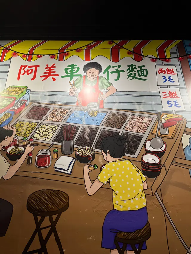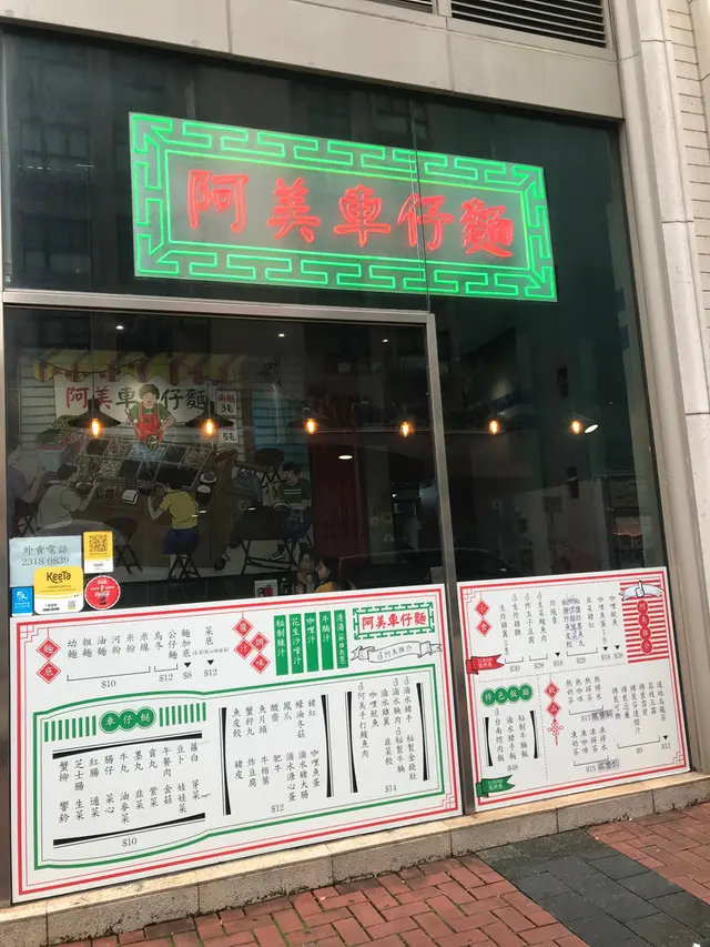 經過大角咀見到這間,“阿美車仔麵餐廳樓底高,有大片玻璃窗可望住街景,牆壁有香港舊車仔麵特色壁畫,獅子山下裝飾,背景播放流行歌曲,令人有份懷念老香港的感覺,座位寬敞乾淨冷氣充足,服務員殷勤招待,多款麵類和車仔餸選擇,湯底係用鮮雞去熬製,完全無任何味精.可以再加花生沙爹醬/秘制辣汁/咖哩汁/牛腩汁自選車仔麵 $82凍檸檬茶 跟餐+ $9油麵蘿蔔菜心蠔油冬菇鹵水豬大腸咖哩魷魚自選車仔麵 $74凍咖啡 跟餐 +$9幼麵蘿蔔豬皮鹵水豬手秘製牛腩秘製金錢肚咖哩魚蛋 6粒 $18韭菜豬紅 $28生炸雞髀$30每一款配料都想食,所以揀咗好多款式,整體味道食材都有驚喜,值得推薦👍查看更多