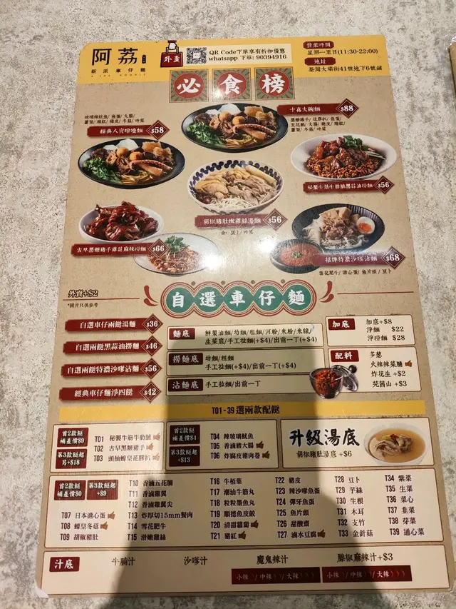 阿荔車仔麵 (荃灣) 網址: https://s.openrice.com/QrbS0x3aB00 地址: 香港荃灣大壩街41號地下6號舖 電話: +852 26606999