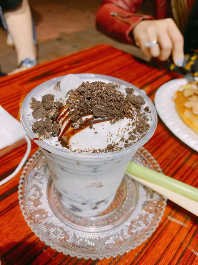 行街行到又攰又熱 經過呢間甜品店見到有刨冰食就入咗去諗住休息吓💆🏻‍♀️咁啱撞正Ian生日應援👦🏻🎤入到去見到有幾位fans食甜品影下相亦都有人專程嚟攞應援🎉老闆以為我都係鏡粉就俾咗一份我😂店內環境寧靜企理 有一份溫馨咁🏡🍧黑糖牛奶Oreo碎夾心綿綿冰 ($88)睇相見到呢個刨冰幾精緻就叫左點知一嚟都係用紙碗裝住 不過唔緊要😂😂綿綿冰牛奶味幾重 但同黑糖漿唔太夾🙏🏻如果落返朱古力醬會更加好🍫分量來講都幾generous 性價比算唔錯👍🏻🧇阿華田醬脆脆窩夫 ($98)不出所料窩夫亦都係用紙碟裝住😂不過窩夫嘅賣相的確唔錯 如果有隻靚碟就好啦🤣但係我杯即叫即整上枱仲係熱嘅🔥加埋兩球雪糕一齊食冰火交融🧊🔥Whipping cream同阿華田醬好食阿華田醬滿佈窩夫坑裏 份量啱啱好🧇同朋友share食 都幾滿足🥰查看更多