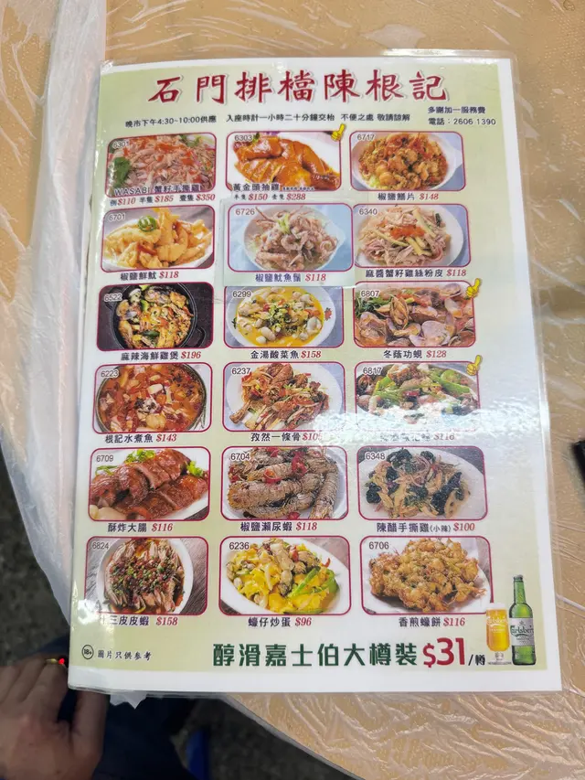 以前係禾峯開業多年既老牌冬菇亭大排檔~陳根記。因為工作關係多左係石門呢邊搵食,陳根記晚餐對我黎講係較貴,但係午餐同下午茶係好抵食。今次就同大家講下午餐先,午餐既選擇已經好多元化。佢既Menu分左4種:1.廚房飯 2.是日精選 3.湯飯 4.抵食推介廚房飯1.滑蛋牛飯飯2.京都豬扒飯3.咸肉豬油炒飯4.生炒牛肉飯午市推介1.蒸魚排骨飯2.椒鹽豬扒食後感:可能係大排檔班低,炒野真係有鑊氣,蒸魚時間亦剛剛好。特別想講一講椒鹽豬扒,平時出街一定係又乾又硬。但係陳根記既椒鹽豬扒真係好食,味道唔會死鹹死辣,肉質彈牙,咬起黎有少少Juice感覺。如果新鮮既炸蒜,真係錦上添花 。而炒飯類味道偏淡,但係講求健康既年代,起碼不是過鹹,要多少少味可以自己落鹽落豉油,算係可接受水平。總結:2餸飯當道既年代,令我更加追求即叫即整既食店。拎出黎熱辣辣,出哂煙既飯菜,未放入口已經滿足視覺既享受。陳根記以54蚊左右既價錢,包凍飲,即叫即炒即蒸,我無投訴。