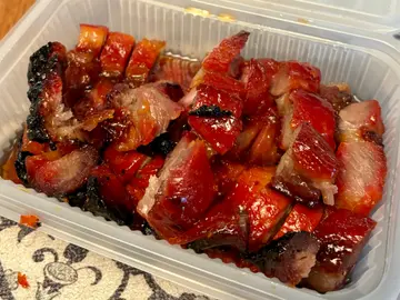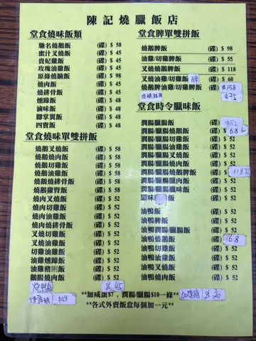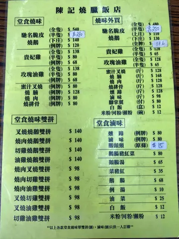 #陳記燒臘飯店 喺網上多咗好多人品提呢間陳記,話佢嘅性價比幾高,坐落喺旺角新填地街街口位,價錢唔算太平民,燒味雙拼飯$52,燒鵝$88以上。叫咗肥叉燒肉飯,店員話叉燒盡量肥但唔係同我講,係同我之後嘅客講,$52嘅雙拼飯賣相幾唔錯。叉燒算唔算肥見仁見智,但最起碼夠腍見到有燶邊。燒肉佢畀咗更受歡迎嘅腩仔,可惜唔啱我杯茶,因為我唔鍾意腩仔嗰種特別嘅味道,我就係鍾意燒肉少少瘦得嚟帶鹹香。本身冇包例湯,加一碗要$10。非常足料滾熱辣,紅蘿蔔夠甜係靚料,雞腳入味,青紅蘿蔔湯味道唔錯,單論呢碗湯$10抵比。如果淨係食呢間餐廳,$62食到一個唔錯嘅雙拼飯加一碗熱辣辣又足料嘅湯,性價比確係高。但如果對畀埋唔同區分較有名氣嘅店舖,好似柴灣新桂香,上環龍邦等名氣店,同樣嘅食物呢度就比佢哋貴。整體嚟講食物質素都可以,冇比較冇傷害,一比性價比即降低。仍然努力追尋心目中最愛嘅燒肉味道。陳記燒臘飯店旺角新填地街250-254號地下D號舖…查看更多