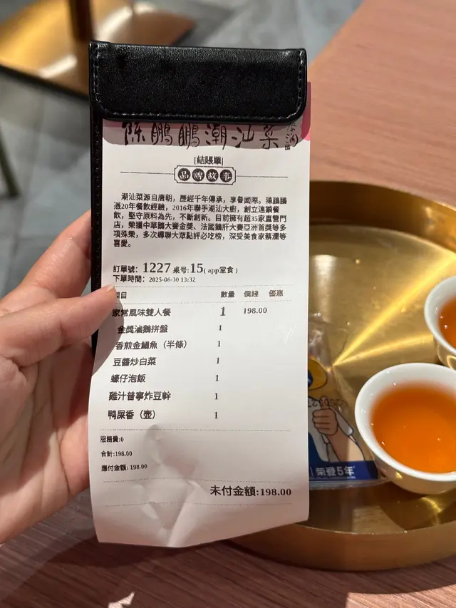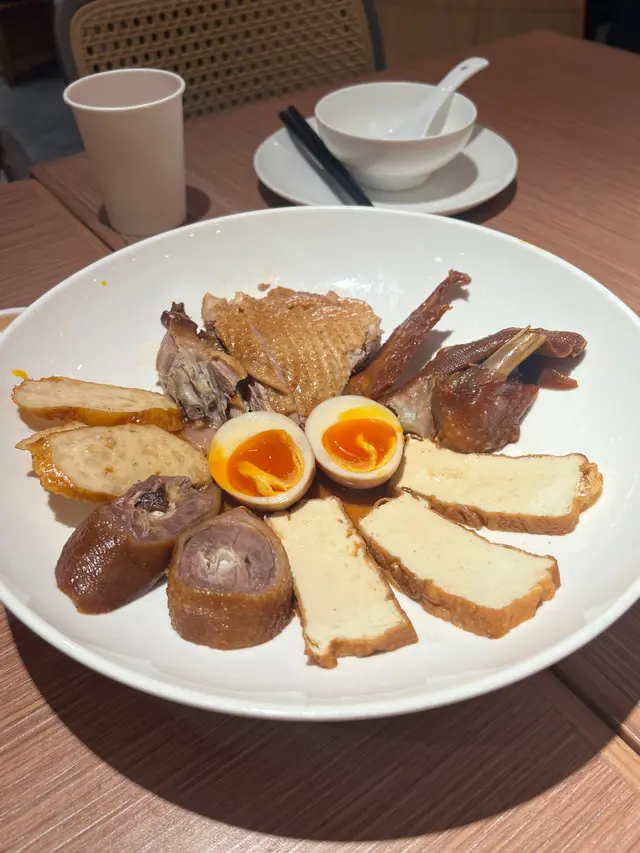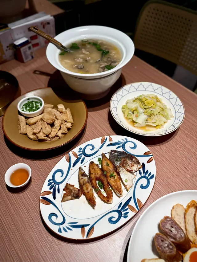之前同屋企人食過沙田分店,而家近近地將軍澳就食到,今次叫咗個好抵食2人餐($198有6樣菜),仲要冇+1,再額外叫其他菜⋯相當抵食又飽足!金獎滷鵝拼盤包括鵝片、鵝頸、廣章(潮洲豬肉條)、滷水豆腐、腩肉及秘滷溏心蛋,一次過試勻6款。滷香濃郁,鵝肉好入味,非常抵食香煎金鯧魚(半條)魚外皮夠脆夠薄,魚肉細緻鮮甜,鹹香四溢,香口不油,是每次必點的菜式豆醬炒白菜用潮州豆醬炒白菜,白菜口感爽脆,好送飯蠔仔泡飯大大鍋已有4人份量,蠔仔大大粒又飽滿,米飯吸收湯汁鮮味十足雞汁普寧炸豆干金黃外表,外層酥內裹嫩滑,豆香味濃郁,再配韭菜切碎後加鹽而成的鹽水,帶有淡淡辛辣味鴨屎香茶/壺茶香幽雅,口感甘醇,回甘持久,食完一餐後飲用完全可以解膩另外加點了芋泥鴨雖然個樣唔靚,但芋泥綿密鹹香,外層酥脆,中間包裹著鴨肉,口感豐富胡椒酸菜猪肚煲湯頭濃郁辛香,胡椒微辣暖胃,豬肚彈牙,除咗爽口嘅酸菜之外,仲有芹菜、蕃茄提味…查看更多