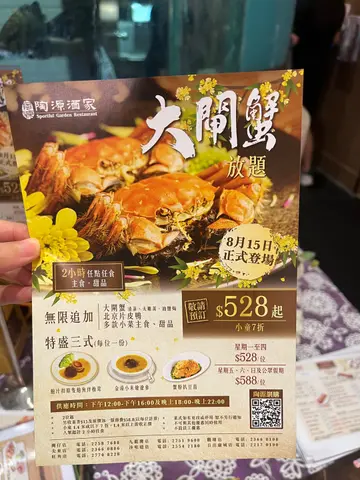 天氣轉涼❄️到咗食蟹公嘅時候啦!即刻book枱去陶源酒家食放題💨💨大廳環境超靚! 枱與枱之間好闊落!放題本身包咗無限嘅大閘蟹🦀🦀🦀每位送原隻鮑魚! 超大粒!不愧為鮑魚專門店🫢厚切黑毛豬叉燒! 好好味! 記得趁熱食🤤金湯遼參! 蟹粉豆苗! 蟹粉米餅! 清晒!!🤤🤤仲可以無限食片皮鴨同6款點心添!20隻清蒸大閘蟹一次過上!! 📸📸📸📸每隻都有拳頭咁大! 新鮮而且好多膏!密密拆! 2個鐘頭我居然食到9️⃣隻! 😎✨特別令我覺得好滿意! 餐廳職員服務好好!!上菜好有禮貌! 中途問吓蟹嘅質素如何?臨走前仲會好細心咁提你飲碗薑茶先走💯💯💯…Read More
