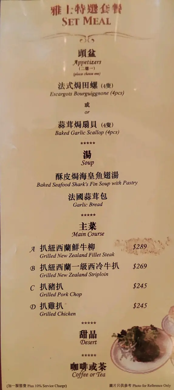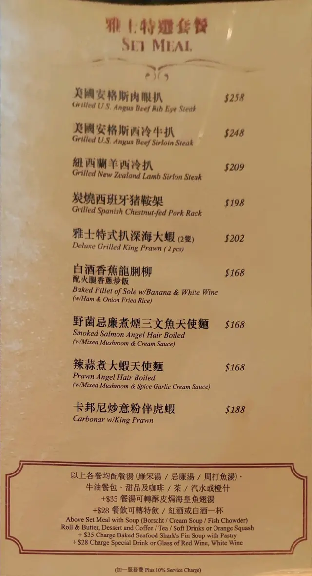 又是懷舊系列です,假日同友人專程去粉嶺覓食,主要係去一間舊式扒房,約有40多年歷史(曾易手),好耐以前都聽過呢間餐廳,今日可一試。餐廳面積頗大,歐陸風格,白色牆身,弧形設計、藤藝吊燈、仿真綠葉佈置、藤椅及木枱,有著英式懷舊扒房之感。假日Lunch好爆場,似乎唔少街坊客。餐牌,有Lunch Set,但一場來到就試下雅士金牌雙拼套餐。餐牌,有Lunch Set,但一場來到就試下雅士金牌雙拼套餐。酥皮焗海皇魚翅湯,跟餐+$35,主打之一,酥皮外脆內軟腍,海皇魚翅湯,質感稠身味道濃郁有鮮味,內有魚翅,美味。法國鵝肝拼牛柳,$269。配蘑菇汁,要5成熟,個擺盤賣相都好有懷舊之感,牛柳睇落比想像中細件,但都幾厚身,肉質軟嫩有嚼勁,肉味濃,但過熟爭少少,鵝肝大小適中,甘香油潤,粗身薯條夠熱不俗,有菜伴食感覺健康。甜品,啫喱,真係好懷舊feel呢。凍咖啡,爽。凍檸茶。食物正常水準,服務態度幾好,充滿懷舊情懷的午餐。…查看更多