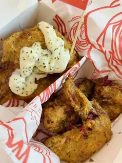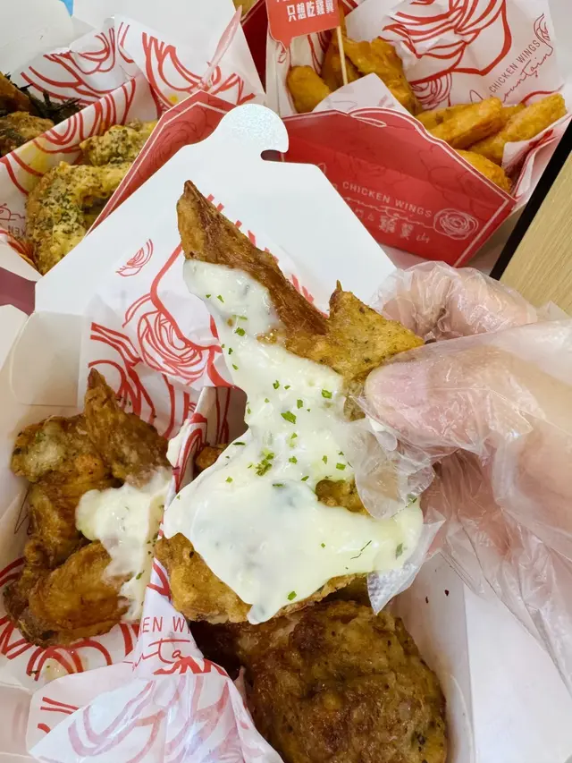 🌹文青風玫瑰雞翼呢個口味係招牌雞翼 係原味雞翼基礎上加上玫瑰味蜜糖🍯表面金黃色睇上去就知道非常香脆,仲有玫瑰花瓣點綴,咬落去雞翼外皮爽脆,雞肉嫩滑多汁,散發出淡淡玫瑰嘅香甜,同雞肉本身嘅鮮美完美融合。香味仲慢慢瀰漫至整個口腔,食完就忍唔住再食多隻🌸黃金咸蛋黃雞翼🥚雞翼被一層厚厚嘅咸蛋黃包裹住,光睇外表就已經忍唔住😍咸蛋黃沙沙嘅口感同雞翼外皮嘅酥脆形成對比,濃郁嘅香味爆發出嚟。咸蛋黃嘅鹹香調味唔會太鹹,反而將雞肉嘅鮮味襯托得更加突出。雞肉依然保持嫩滑,就算食完雞翼口中依然留有嗰股濃郁嘅香味,非常回味😜😜避风塘蒜香鸡翼口味同小食都非常推薦💃…查看更多