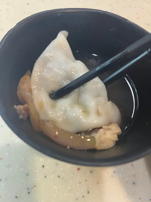 因為加多個餸就要加14 ,媽咪就嗌餃子中size 麻辣雞米線麻辣雞零上嘅 見到其實都多油,所以唔好直接落唔落去而且都真係幾辣我阿媽食得辣,自然面不改容🤣🤣我覺得好勁,我食幾粒洋蔥都已經覺得好Spicy😳😳🙈不過係好香口辣得好過癮嗰種,所以加落去我個碗做湯底就一流 我對佢呢種厚皮餃子冇咩興趣, 個餡料唔係好多