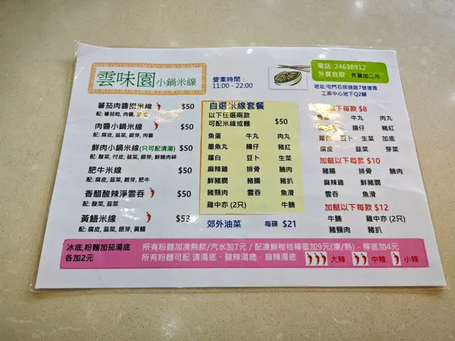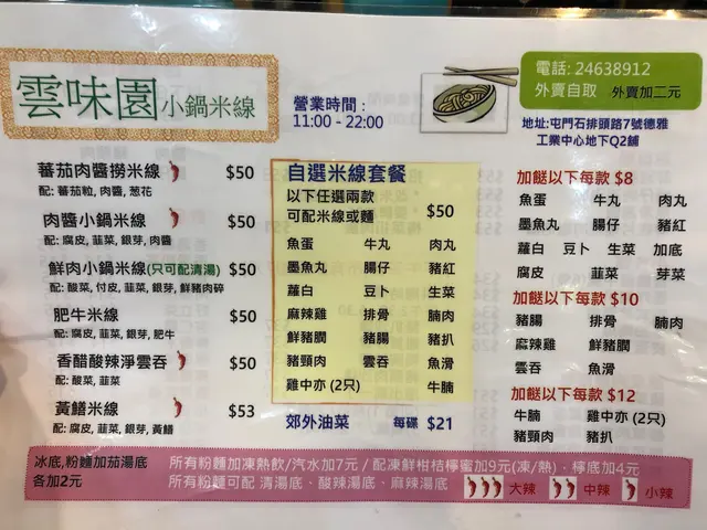 雲味園 (屯門) 網址: https://s.openrice.com/QrbS0Rqi000 地址: 香港屯門石排頭路7號德雅工業中心C座地舖 電話: +852 24638912