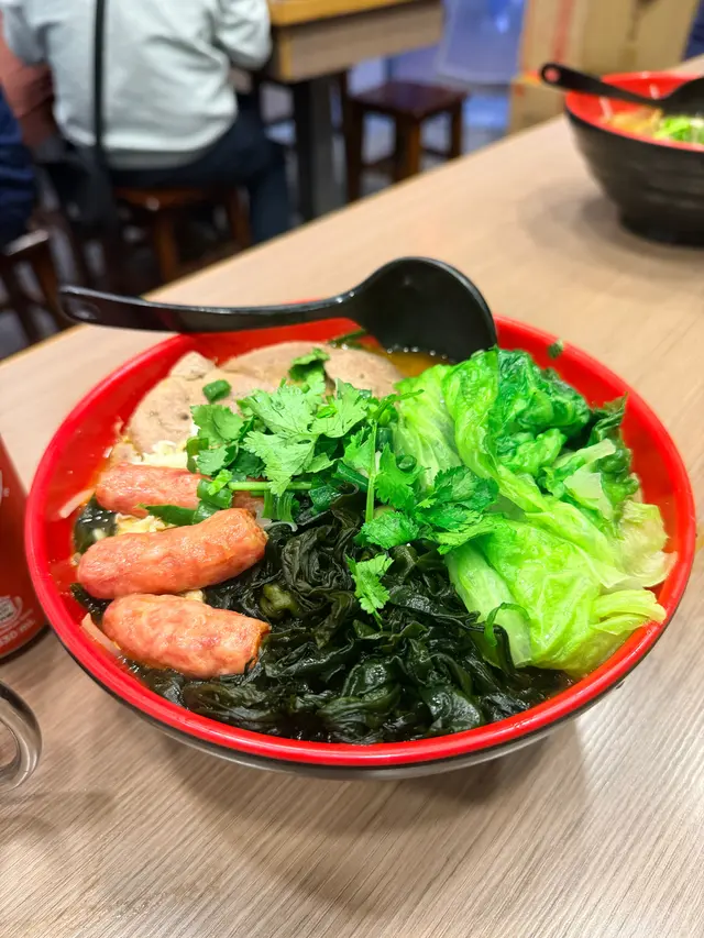 牛腩小鍋米線(小酸辣)配料:芽菜、酸菜、韮菜、蔥、芫茜追加配料:雲吞、台灣腸牛腩係另一款人氣之選,牛腩滷得入味又軟腍,帶少少牛香油潤感,配埋酸辣湯底又唔膩。加嘅雲吞皮薄餡多,台灣腸香氣濃郁、爽彈惹味,為整碗米線加分不少。