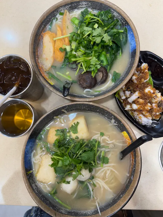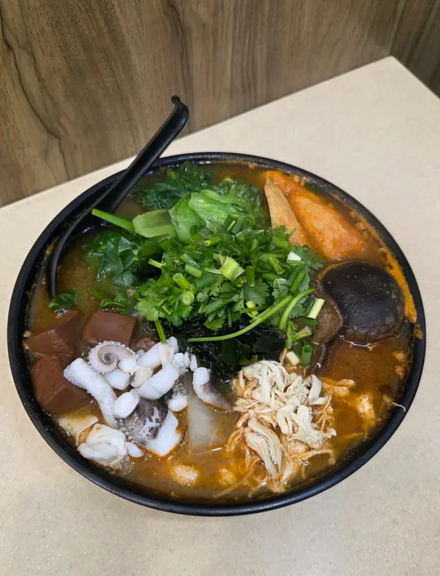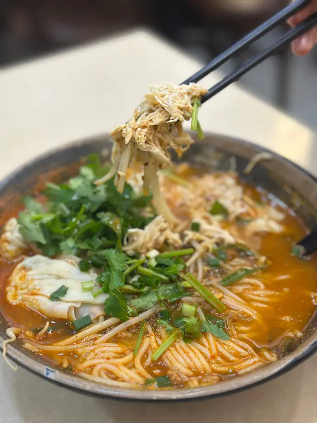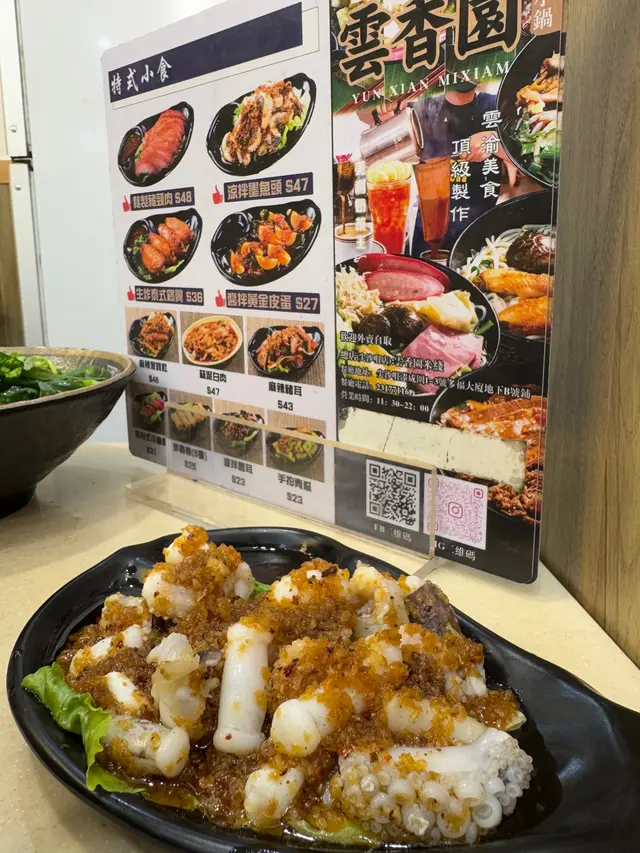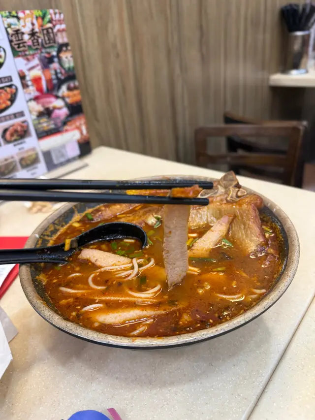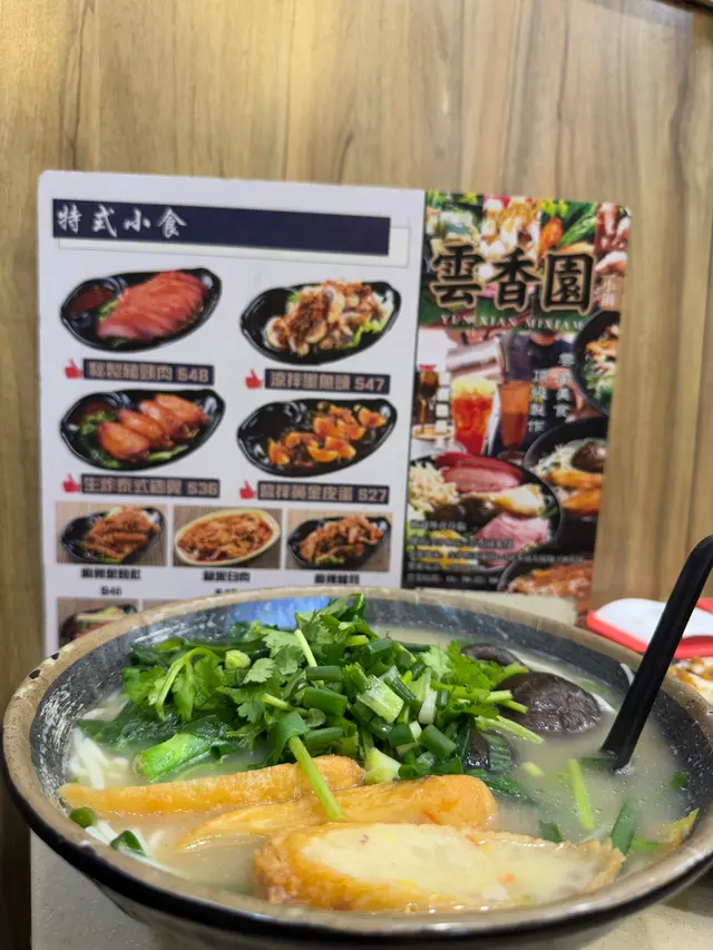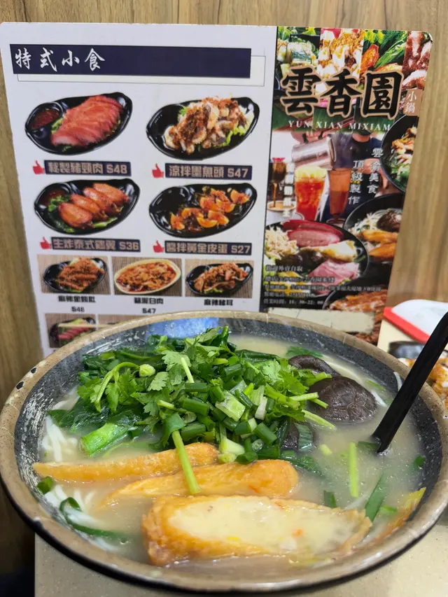 。雲香園米線,揀咗酸辣湯底,哩碗米線配料勁豐富,有雞翼,冬菇,雞絲,魚春捲等。湯底絕對係靈魂,每日落足料煲制,仲要熬煮6個鐘。湯底酸辣度啱啱好,飲落幾開胃。幾款配料各有特色,雞翼鹵得幾淋,冬菇同雞絲軟嫩,酸菜爽口,蔬菜新鮮鮮甜,米線索咗湯之後更好食:)。熱拌米線,配料加咗墨魚丸同肥牛。熱拌米線同湯米線又係唔同風味,撈汁酸辣惹味,再落入香菜榨菜肉碎等配料,米線爽口醬香濃郁。肥牛份量都幾多下,入口牛味十足,墨魚丸彈牙爽口,全碗食曬真係好飽