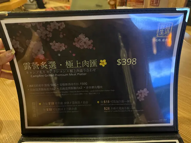 位於銅鑼灣這個鬧市中,有間由戶外至室內都以露營⛺️主題餐廳,枱櫈、餐具都係露營所用既用品,仲有不同風格既打卡位,簡直置身於露營中⛱️戶外區都很有露營帶來的自然氣息🌸實際這間是日式居酒屋,由日本師傅主理,主打燒肉、壽司及丼飯套餐,仲會推廣優惠比顧客,而家就做緊日本清酒放題,啱晒鐘意飲清酒既朋友;呢度Weekend仲會有live music表演,環境加上氣氛,成班朋友可以Chill一晚!💐💥前菜:上盤精緻既漬物,擺盤好靚,包括金箔漬蓮藕、牛蒡絲、日式醃蘿蔔絲、雞肉明太子、中華海蜇、醃青瓜蕃茄,每款細細碟,好開胃🤩💥七彩海鮮丼 旬の和膳 (刺身及丼)✨刺身肥美大件,價錢唔算貴,勝在新鮮,每一口都鮮味十足✨刺身丼丼裡面有吞拿魚、三文魚、蟹棒、八爪魚同蟹籽,每一樣都新鮮得不得了,魚生切得厚薄適中,口感滑嫩,特別係蟹籽,咬落去卜卜聲,好清脆又好咬口,正👍🏻💥露營炙選・極上肉匯($398)✨A4宮崎和牛薄燒豐富大理石油花、輕輕一燒,即刻聞度濃郁牛肉香氣,牛味香濃又嫩口,愛吃和牛既人士必定一試✨安格斯西冷牛扒油脂分布均勻,肉質厚實,軟嫩中帶有嚼勁✨北海道黑豚梅花肉梅花狀油脂,肥瘦均勻,肉質彈牙,肉味濃而甘香,肉嫩多汁✨北海道黑豚腩肉五花腩油脂分布平均,肉質嫩滑,而肉味亦相對地濃郁。記住唔好燒太燶,咁就可以好好品嘗嚟自日本嘅豬五花腩啦