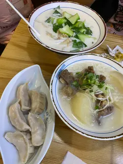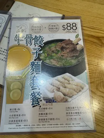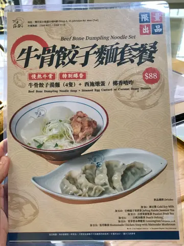 去港島追chiikawa電車途中見到餐廳本來望緊menu果陣咁啱係外面就見到﹗咁有緣而且menu都幾吸引就決定係你啦牛骨餃子麵套餐(有甜品、湯麵、4隻餃子)餃子有韭菜或白菜,揀咗白菜豬肉餃子甜品都有兩款,西施燉蛋或椰香咋喳,揀咗燉蛋湯底係好濃厚嘅牛骨味,直接湯湯飲都好正麵底係米線,可以加$3轉其他麵米線有咬口,好索湯餃子係終極MVP﹗﹗﹗餡好足,菜同肉嘅比例恰到好處加落牛骨湯入面仲索埋啲湯如果食其他麵餐都一定要加餃子