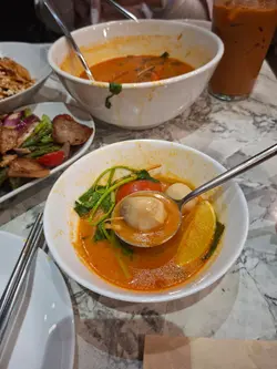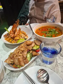 旺角🚇The Forest商場呢間青花🌴,餐廳以叢林為設計主題,🥰天藍色牆身四周圍滿翠綠植物同乾花點綴🌿,樓底高開揚感強,搭配落地玻璃窗採光度一流☀️,而且仲有戶外用餐區,猶如置身🇹🇭泰國蔥蘢叢林咁寫意。惹味拼盤集合🐓雞皮卷、泰北酸肉香腸及酥炸雞棗🔥於一身,每款食物都好惹味香口🌶️,配埋泰式醬料風味滿滿。白冬蔭功·南薑椰汁雞湯一上桌🥣,香茅同檸檬葉既香氣已經撲鼻而來🌿。白冬蔭功作為傳統冬蔭公既進階版本🌟,椰香味濃郁勝過一般餐廳🥥,酸辣平衡得宜🌶️,質感順滑,入口既層次感相當豐富,🤤令人一試難忘。荔枝菠蘿紅咖喱大蝦色澤誘人😋,紅咖喱香氣馥郁🍛,大蝦飽滿肉質鮮甜🍤,咬下去滿口蝦香。紅咖喱既香辣味恰如其分🌶️,鮮蝦同水果既組合卻出人意料咁夾🍍,酸酸甜甜既感覺提升左整道菜既層次感,絕對高質滋味⭐。醉鬼惹火炒粿條炒得恰到好處🍝,火候掌握一流🔥,粿條帶有少少焦香夠哂鑊氣,既惹味又唔會過於濃烈。🥢配料豐富份量十足,真正體現出泰式炒粿條嘅香辣🌶️。…Read More