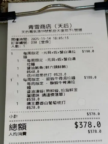 位於電后❣️青雪商店❣️係一間區內超人氣❤️🔥嘅拉麵🍜店,招牌菜嘅雞🐔白湯拉麵超多捧場客,店主將原隻冰鮮三黃雞加雞殼,豬筒骨,豬脊骨,蔬菜同薯仔等熬足最少8️⃣小時,再將湯料打碎隔渣製成極濃郁雞白湯,真係落足心機👍🏻其他小食同食材亦相當有質素😋👍🏻鍾意食拉麵嘅朋友仔真係要試吓🫶🏻❣︎熟成醬油清雞湯拉麵❣︎醬油湯底鹹鮮醬香😋拉麵麵質有彈性又有嚼勁,有別於一般嘅拉麵,配料有豚肉,煙燻义燒,雞肉同溏心蛋,夠晒足料👍🏻❣︎元貝x蝦x蟹白湯拉麵❣︎超濃郁嘅海鮮湯底😋層次十足,飲完都唔會口乾,真材實料👍🏻 ,配料有豚肉,鮮蝦,雞肉同溏心蛋,特別推薦溏心蛋🤤蛋黄味道濃郁滑順,超好食。❣︎醬油鮑魚❣︎(鮮六頭鮮鮑)⭐️必食推薦😋👍🏻鮮六頭鮑肉質肥厚Q彈,以特製醬油同藤椒醃製而成,非常獨得清香。❣︎醬油漬蝦❣︎(熟鮮蝦)醬油蝦新鮮彈蝦😋最貼心係上枱時已經剝埋殼,非常方便食用👍🏻❣︎信州蘋果梳打❣︎果香濃郁😋甜中帶酸,入口清爽。❣︎晴王麝香白葡萄梳打❣︎味道偏濃郁,加埋入口嘅汽泡🫧係食拉麵嘅最佳拍擋。…查看更多