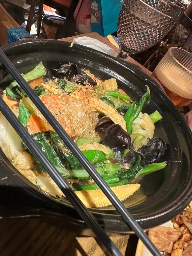 啱啱同朋友一齊食咗個四人套餐,真係超豐富!😋 成枱都擺唔晒啲餸,睇到都開心,食落更加滿足~每道菜都好有特色,味道層次分明,真係食到停唔到口!🍲 雜菜粉絲鍋 :材料勁多,有木耳、粟米條、粉絲、椰菜花、紅蘿蔔等等,香味撲鼻,一上枱就令人流晒口水🤤。湯底好鮮甜,啖啖都係新鮮味道,暖笠笠好舒服~🥬 蒜蓉炒通菜 :炒得好香,通菜又脆又嫩,食落好清爽,真係一流!👍🦐 大蝦柚子沙律:微辣但唔會太刺激,柚子酸味啱啱好,配埋大蝦超清新~夏天食就啱晒!🌞🐟 泰式魚翅湯 :雖然份量唔算多,但湯底好鮮甜,仲有兩款醬料配搭,一款酸辣、一款折醋,飲落層次感十足,好有泰國風味~🍍 泰式甜酸咕嚕肉 :呢道主菜就有啲細份,略為失望😕。不過菠蘿甜味同咕嚕肉幾夾,只係肉唔夠脆,但整體甜酸味都幾開胃~🍢 滋味小食拼盤 :有豬頸肉、春卷、炸豬,三款醬料任你點!春卷炸得金黃酥脆,咬落卡滋卡滋,好正!💥🪑 座位好舒服,食得又放鬆~不過店員會安排客人坐出面,令餐廳氣氛熱鬧啲,但可能會覺得有啲逼~🥤 至於飲品呢:泰式奶茶:偏甜但好有風味🧋 椰糖青檸梳打:味道特別,值得一試🍈雙檸泰冰茶:清新檸檬香,檸茶 fans 必試🍋呢個用餐體驗好開心,菜式都幾多元化,啱晒鍾意試新嘢嘅朋友~下次一定要再嚟,繼續發掘更多美味!😄🍽️查看更多