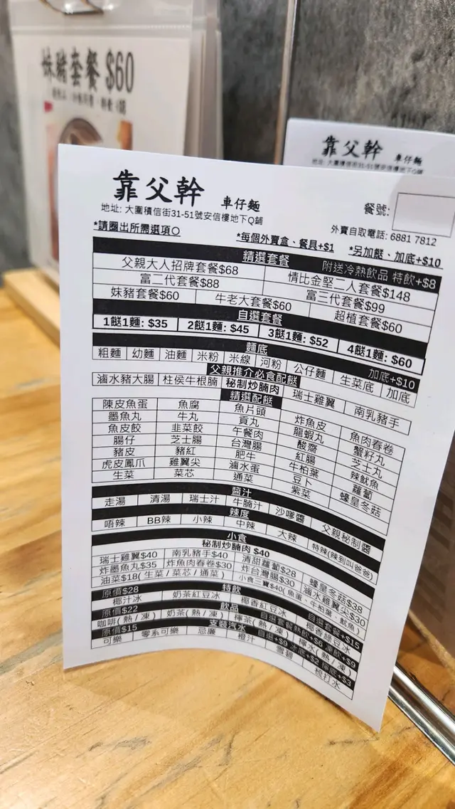 靠父幹車仔麵 (大圍) 網址: https://s.openrice.com/QrbS0Sd8D00 地址: 香港大圍積信街31-51號安信樓地下Q號舖 電話: +852 68817812