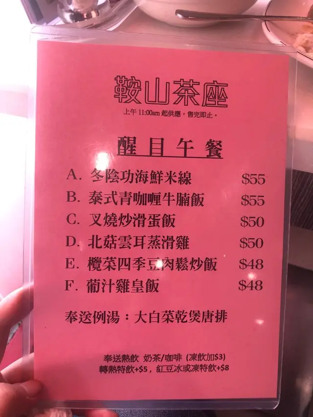 今日要約有幾個朋友去傾嘢, 就揀咗呢間睇落幾闊落既鞍山茶座. 我地揀咗張大枱坐.阿姐都幾好禮貌,  耐心等我地幾個點嘢食.我地叫咗: 蔥油厚切豬扒蛋飯菠蘿海鮮炒飯沙嗲肉片炒河.試吓茶餐廳D基本嘢.唔洗10分鐘內已齊晒所叫食物, 好快手做起喎!呢個蔥油厚切豬扒蛋飯, 堅厚切! 真係唔止1cm! 食落肉感很好! 一D都唔梅! 質素超高! 加上 蔥油, 飯香! 仲要成兩隻蛋! 食完十分滿足!朋友叫既菠蘿海鮮炒飯, 勁大碟! 有蝦、菠蘿、魷魚、蟹柳,  粒粒飯香! 碟炒飯一上枱已好吸引, 仲要咁大碟同足料, 廚房有料到喎!再另外既朋友叫沙茶肉片炒河, 又係OK wor! 沙茶係好香既沙嗲, 河粉係幼條, 炒得唔會肥膩, 條條爽滑! 食落新鮮既肉片, 再上少少芝麻係上面, 成件事CP值好高! 店內環境有關於馬鞍山歷史既相望吓, 唔講真係唔知馬鞍山以前係咁有趣!一般社企餐廳質素都係麻麻, 但呢間鞍山茶座社企CP值超高!  堅得! 以後開飯唔洗煩啦!查看更多