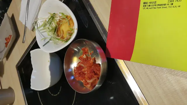 今日跟朋友到尖沙咀學做小手工,做完之後就到附近晚餐啦~星期六晚的尖沙咀,周圍都是人,要搵位食晚飯,也不容易呀!逛著逛著,就來到H8啦~~ 見到有間未食過的韓國餐廳,韓松,就試試它吧~韓松在H8一樓,佔領全層,地方寬倘,木的枱椅加上綠色的Cushion,很有大自然的氣息~我們被安排坐在大玻璃隔離的枱,可以看到厚福街的街景,很不錯~餐牌上全都是套餐,有烤豬、烤牛、烤鱆魚或春川辣炒雞,套餐全都是二人份量,另外也有些散點的小食~很久沒食過春川辣炒雞,就點一個春川辣炒雞套餐吧!先上前菜,有泡菜及酸蘿蔔,質素正常,當然沒有韓國的好食啦!隨餐的沙律也不馬虎,用料新鮮,配上酸酸甜甜的沙律汁,開胃非常!另外也有一碗小小的白粥,厚身綿滑的白粥添上一點點的紫菜及芝麻,竟令清淡的白粥變得香口非常!食著食著,主菜春川辣炒雞就上桌啦!成品很大的一盆呀!! 而且顏色火紅火紅的,看似很香辣呀~~除了有雞外,還有配菜如椰菜、洋蔥、紅蘿蔔、薯仔及年糕等,稍稍加熱,炒一炒,就可以食啦~ 雞肉嫩嫩的,配以濃烈的辣味,辣得過癮呀~~ 年糕口感煙韌而不黏,配搭著爽脆椰菜,粉稔的紅蘿蔔及薯仔,甜美的洋蔥,美味呀!!另外亦配有一小碗魚卵飯,以石頭窩奉上,白飯上放滿魚卵、紫菜、醃蘿蔔及青瓜,加上一點點辣醬,伴一伴,一口飯可以有齊這麼多配料,豐富又滋味呀! 放多一會兒,更有香噴噴的飯焦可以食呢~食飽飽,也不多坐啦~~ 因為小店的抽風系統麻麻,雖未至於是煙霧迷漫,始終這是一間烤肉店呀,總有一點點油煙味呢!!查看更多