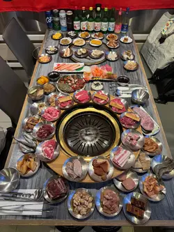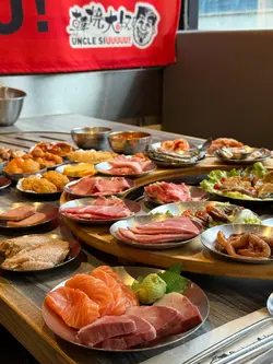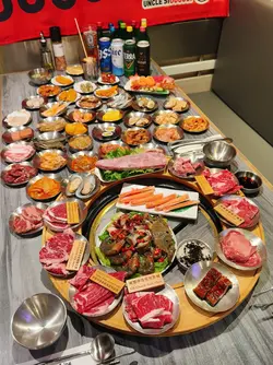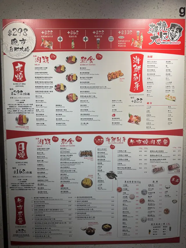 咩叫大排筵席?🤔💭 嚟到「韓國大叔」就明啦!👨🍳🔥 枱上面放滿過百款食物🍖🍣🍤,真係睇到都開心到嘩嘩聲啊~😍✨ 晚市120分鐘任燒任食⏰🔥,仲要係瘋狂上菜模式🎉,細細碟,多多款擺到成枱都係📸,相機先食絕對冇難度🤳💖講真,啲肉真係高質到爆!🤩🇺🇸美國安格斯下肩胛肉、肩胛翼、加上🇦🇺澳洲黑安格斯封門柳、牛板腱、牛頸脊等多款靚牛肉🐂🔥,燒完外脆內軟,juicy到不得了~😋💦仲有燒魚鮫🐟同燒豬皮🐷,係必食之選!👍 我兩個小朋友仲瘋狂愛上咗韓式魚蛋🍢,話好彈牙好過瘾🤣🎉 細佬仲未夠90cm係免費📏,但佢食得仲多過我哋😂🍽️今次仲撞正細佬就快生日🎂🥳,原來呢度生日有蛋糕送🎁,多過8人仲可以一人免費(星期日至四)👨👩👧👦,真係開心到癲咗!🎊💃 仲有呀,60歲以上長者都有85折👵👴,下次帶埋公公婆婆嚟食~❤️🌈晚市訂枱優惠真係抵到爛!💰🤯 每四人送原塊安格斯西冷牛扒🐄,我哋揀咗加$88任食海鮮刺身🐟🦐,仲可以用$1追加韓國直送 1+慶州千年韓牛西冷一塊 🐂🇰🇷或醬油蟹拼盤🦀🔥 !海鮮方面有元貝🐚、大蝦🦐、鰻魚🍱,刺身厚切又新鮮💎,油甘魚腩🐟同牡丹蝦🦐真心正~🤤👌 更可以升級食法國或韓國生蠔🦪,記得要預早一日訂啊,肥美到不得了😍💦飲品方面連酒精都有好多選擇🍺🍷,男女都會搵到心水💁♀️💁♂️。仲有韓式紫菜卷🍙、冷麵🍜、炸物🍟同雞翼🍗,小朋友實鍾意!👦👧 最後仲有樣嘢一定要提:21:00後入座每位減$40🌙💰,夜鬼家長出動啦!🌃👨👩👧👦開心就係咁簡單💖,一家人食餐好👨👩👧👦,已經係最好嘅時光🌈💫 …查看更多
