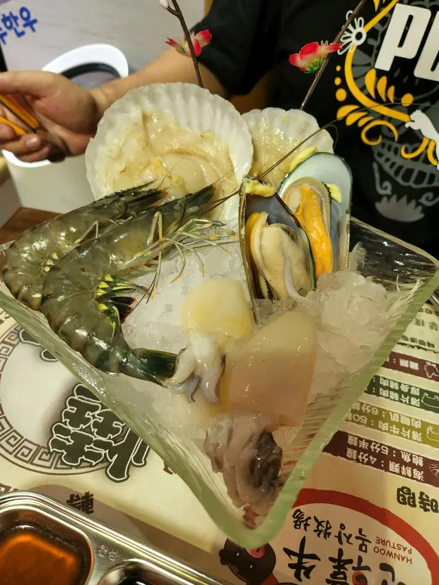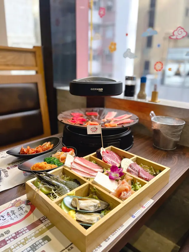 呢日同friend子去左銅鑼灣【韓牛牧場】食韓燒lunch~職員安排左個窗邊卡位俾我地,可以望到街景都唔錯~因為我地兩個都係食肉獸,所以就叫左1++韓牛韓燒定量午餐(二人份量)同1++韓牛牛肋骨湯飯,估唔到份量都幾多喎!兩個人食真係夠晒飽呀~呢度採取半自助形式,可以先到自助區自取韓式前菜和沙律,有很多款式選擇,仲可以無限量任添!飲品都係出面雪櫃自取~冇幾耐,主角就出場了……【1++韓牛韓燒定量午餐】包左:1++韓牛牛肋骨肉、韓醬1++韓牛肩胛、西班牙黑五花腩、韓牛和黑毛豬腩肉、韓式雞腿肉、虎蝦拼半殼青口,有肉有海鮮,好滿足!特別喜歡韓牛那種香濃嘅肉味,入口好嫩滑,黑毛豬更加冇得輸,虎蝦肉質亦好彈牙呀~ 【1++韓牛牛肋骨湯飯】啲湯好清甜,仲有好多韓牛係入面,真材實料,配白飯真係一流呀!午餐可以食韓燒,每人都係200蚊左右,價錢都算幾抵,而且份量啱啱好唔會好heavy, 的確不錯啊!查看更多