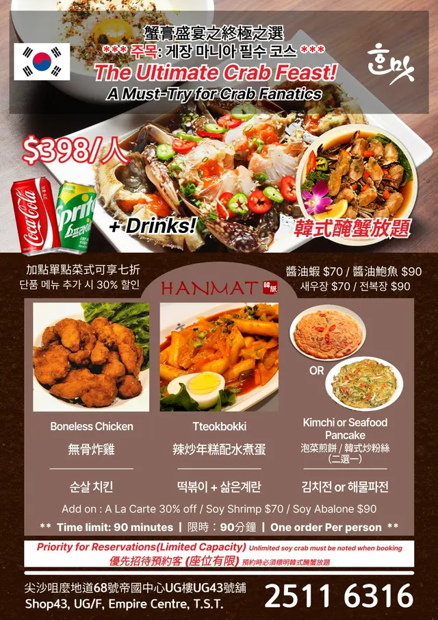 韓脈 (帝國中心) (尖沙咀) 網上訂座享低至7折優惠兼賺Rice Dollars 網址: https://s.openrice.com/QrbS0Bzi5W0 地址: 香港尖沙咀麼地道68號帝國中心UG樓UG43號舖 電話: +852 25116316