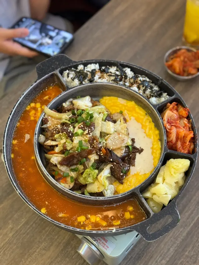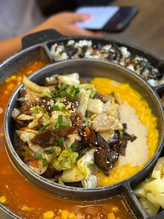 今日到南豐中心行街買野,準備落去川龍旋轉斜路時,望到有間叫「韓閣」的餐廳🍴,仲有個代言Icon 招牌公仔,見幾得意心血來潮走去試下,位置真方便,係正南豐中心後面。韓閣歡樂盤:用上gas爐呈上助熱、選擇困難症的可簡這歡樂盤 ,有曬前菜主菜。特調三重芝士鍋拉絲效果是必需的,因為是三重芝士,層次較豐富,奶香十足,包裹已醃調的牛肉,不錯。韓式牛肉常用醬油、糖蜜、蒜等調料烹調,呈現出濃郁的甜香味。從牛肉本身的肉汁中釋放出來的鮮甜滋味,與調味料形成良好的平衡。將牛肉在烤肉或鐵板上烹調更形成可口的煙燻香氣,配上味素海苔飯,一啖接一啖。用上鐵板烹製的牛油粟米滑蛋好滑捋捋,可即烹即食熱辣辣,充滿粟米香氣帶甜。百香果桂花烏龍:百香果獨特的香甜果香是這款茶的主要風味。百香果的酸甜滋味賦予了茶葉豐富的果香。桂花的淡雅芳香點染了茶葉,使茶飲散發出高雅的花香。清新茶韻:烏龍茶特有的清新茶葉香味成為了這款茶的基底,帶來醇和的茶葉韻味。茶餐:蕃茄辣湯 泡面:蕃茄的酸甜滋味是這道泡麵的基調。湯底充滿了天然的蕃茄鮮甜。配上泡菜,帶來辣味,麵條韌彈:泡麵麵條的韌性和彈性,在湯汁的淹染下盡顯風味。面條做到掛汁效果,整體湯頭濃郁酸甜、辣香、鹹味交織。吉列豬排拼豬肉粉絲餃煙鴨胸沙律🥗:吉列豬排酥脆外皮,油炸後酥香四溢,肉質軟嫩多汁,帶有豬肉本身的甜香味。豬肉粉絲餃:餃子皮Q彈,餡料鮮美多汁。煙鴨胸沙律: 煙燻味道濃郁,帶有一絲苦味,搭配酸甜沙拉醬,形成味道的對比與平衡橙汁菠蘿梳打:濃郁果香:橙汁带来的濃郁柑橘香气,清新酸甜,碳酸梳打水的清爽泡腾感,与酸甜果味形成有趣的反差饮后留有持久的柑橘甜香,令人垂涎欲滴的回味体验。總結:意想不到的高質韓國菜誠意之作的歡樂盤 抵食茶餐查看更多