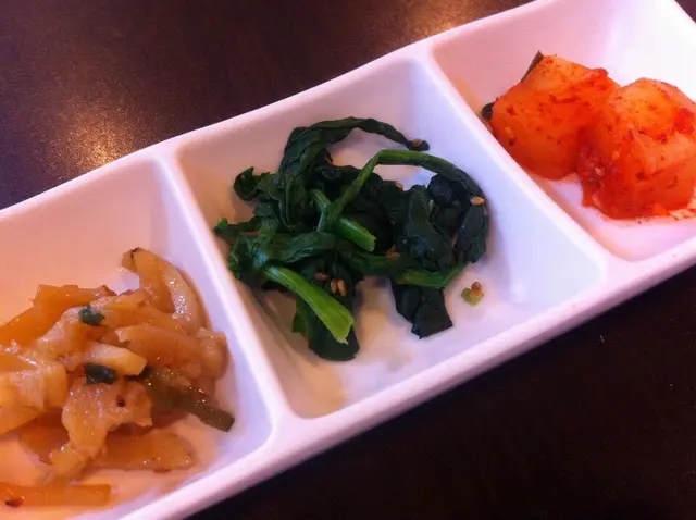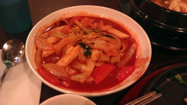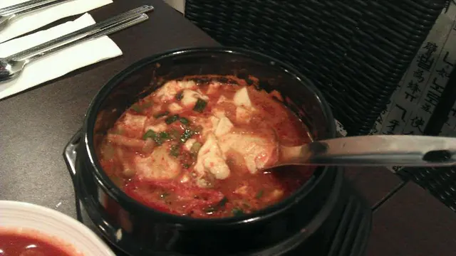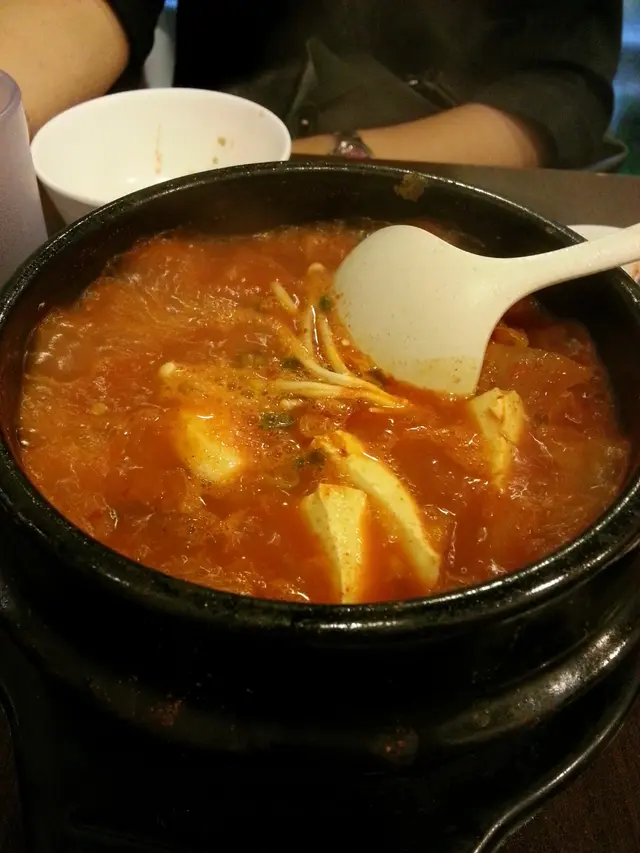 前菜 3 小碟,左起第一格不知是什麼,咸咸爽爽的,醃蘿蔔乾嗎?中間係菠菜,又係咸咸爽爽的,多了份菜甜味。辣蘿蔔,外層跟泡菜一樣味道,微辣帶甜,爽而充滿水份,但裡面無味的呢。什菌湯麵,即食麵都要洒生蔥花?最討厭。Menu 照片果然只可作參考,相差得非常遠喎﹗辛辣麵落水太多,水汪汪變成清湯底,清到見底,味道啖如水。窩蛋撈埋麵條一食,幸好有蛋黃添了丁點味道,唔難食。什菌有金菇、本菇同鮮冬菇,求其掉晒落去一鑊熟,狂兜亂舞!倒出黎亂七八嘈就上檯,可否執靚少少先出比客呢?衰過自己屋企煮囉﹗何解各同事的石頭飯及人蔘雞湯都已到齊,反而我個即食麵最耐?我地還以為剛出去買辛辣麵返黎添!莫非我個麵要即煮,而其他一早煮好只需翻熱?淺嚐幾口人蔘雞湯,個湯真係幾好,下次再試試。本來想食近期大熱既部隊鍋,但 lunch 獨自食個鍋似乎有點嚇人。…查看更多
