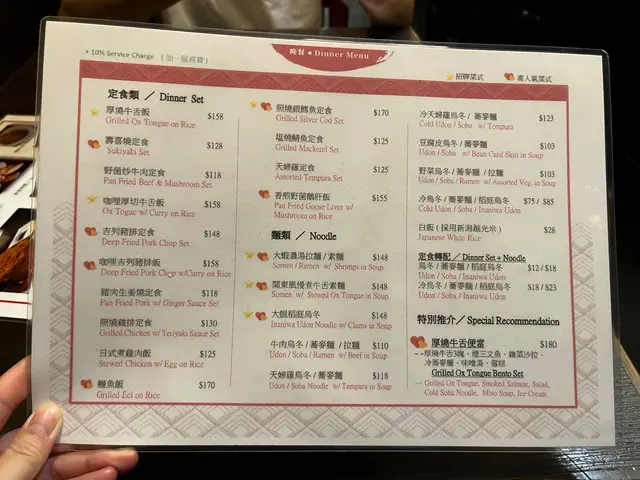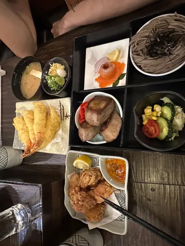 門外寫住創業於1993年,呢間日本料理老店經歷左咁多年依然屹立不倒,果然厲害踏進店舖內,顏色以柔和嘅淡黃色,白色為主調,有吧枱高椅子嘅位置,亦有木枱凳黎呢度,我係想試佢最出名嘅牛舌好食!餐品,飲料種類好多我揀左 牛舌便當🍱$180 呢個便當好多野食,麵豉湯,雜菜沙律,煙三文魚,冷蕎麥麵配鰹魚汁,牛舌3大件,另有雪糕泡芙超級肥厚且多汁嘅牛舌,外層燒到十分香,灑有黑椒碎、芝麻碎,內層好腍,唔會韌,仲好彈牙煙三文魚大大片,有點煙熏味,都幾新鮮冷蕎麥麵咬落係比較爽身,唔會好腍壽喜燒定食 $128 熱辣辣嘅瓦煲上枱,材料豐富,有野菜,紅蘿蔔,金菇,爽口腍身冬菇,牛肉片,生鵪鶉蛋配軟腍日本米飯,麵豉湯,中華沙律為前菜湯底甜甜的,好飲,肥牛嫩滑唔多根,撈勻隻生蛋食,味道更佳什錦天婦羅🍤 $120外層炸得好香脆,唔會有麵漿過厚嘅情況,有蝦X2 , 茄子,冬菇,南瓜,蕃薯,特別鍾意蝦,蝦肉大隻彈牙,味道鮮甜,茄子都幾好,厚肉又juicy炸軟殼蟹沙拉 $110超大盤的,冇諗過軟殼蟹切件藏係沙律內濕濕地,都唔會好腍,依然好好味好多青瓜,車厘茄,粟米粒,仲有酸酸嘅沙律醋自由配搭