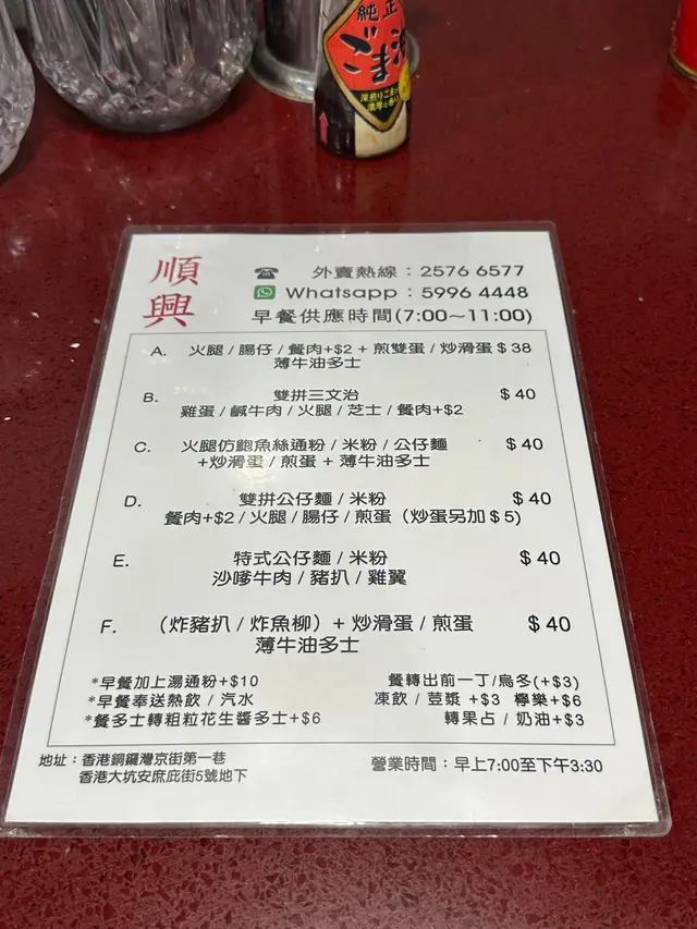 順興茶餐廳 (大坑) 網址: https://s.openrice.com/QrbS00LS000 地址: 香港大坑安庶庇街5號地舖 電話: +852 25766577