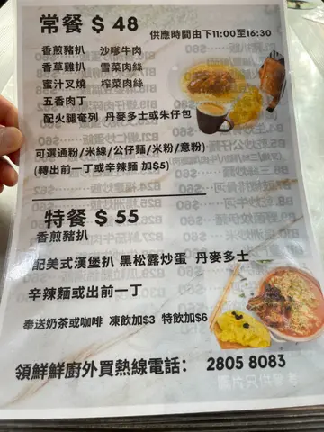 幾時都係在屋邨嘅茶餐廳食先夠feel,今日就係翻新了嘅大排檔位置變成嘅熟食亭,以前是坐露天位置,翻新後不再是室外,室內還有齊冷氣,朋友兒時在邨就通常會在這裡食飯,雖然現在已經變了,但往日情懷依舊,所以座下食個餐,剛好是下午茶時間餐牌內選擇多,而比較吸晴就係特餐,特餐香煎豬扒配美式漢堡扒,配黑松露炒蛋及丹麥多士外,麵可以選擇辛辣麵或出前一丁,今次就要了辛辣麵,飲品就加了$3變凍飲,上枱時一次過一份特餐,份量十足,最欣賞就係原包調味跟餐上,冇花冇假,當然要趁熱放湯攪勻,先食了件香脆丹麥多士,配上個炒滑蛋同香濃黑松露,味道提升了不少,還有塊香煎豬扒,雖然唔係太厚身,但入口依然香脆軟熟,還配埋我十分喜歡嘅美式漢堡扒,未食麵已經一半飽,加埋個浸了一陣嘅彈牙辛辣麵,真係十分滿足!加埋現在有個菇go eat 活動,食得飽又有機會抽獎,真係一舉兩得!