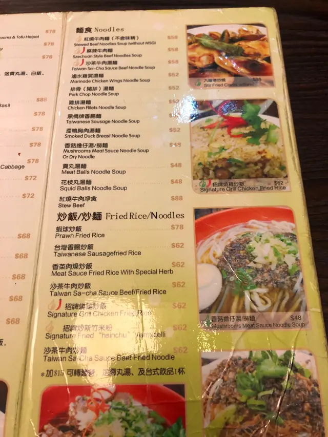 四式台灣香腸(4條)| Assorted Taiwan Sausage (4pc) $66四款香腸分別是:飛魚卵、櫻花蝦、墨魚和黑鮪魚。台灣香腸的特色都是皮脆而且帶甜味,飛魚卵香腸帶一點日式芥末的味道,很適合作為小食。櫻花蝦的味道則較為淡,要細心品嚐才吃得到它的味道。墨魚和黑鮪魚則略帶海鮮味。••••••••••••••••••••••••••••••麻辣牛肉麵 | Szechuan Style Beef Noodles Soup $58湯底牛肉味濃,牛肉十分入味牛肉味又突出,肉質軟嫩,配以少許麻辣,更為惹味,但麵條略為淋身。••••••••••••••••••••••••••••••鹽酥雞肉燥飯 $56鹽酥雞肉十分邪惡,但很有夜市風味,肉燥入味,飯的份量足夠,整體份量不算少。••••••••••••••••••••••••••••••炸鹽酥菇 | Deep Fried Mushroom $48很有台灣夜市的味道,香口,較為重口味。••••••••••••••••••••••••••••••蝦球炒飯 | Prawn Fried Rice $78賣相一般,味道濃,飯炒得夠乾身,但性價比來說比較推薦牛肉麵或炸雞排肉燥飯。••••••••••••••••••••••••••••••台灣香腸炒飯 | Taiwanese Sausagefried Rice $62台灣香腸可口美味,飯炒得夠乾身,份量適中。••••••••••••••••••••••••••••••香菇擔仔撈麵 | Mushrooms Meat Sauce with Dry Noodle $48肉碎份量充足,味道剛好,香菇味不太突出,但麵條略為淋身。••••••••••••••••••••••••••••••+$15更可多配貢丸湯及飲品貢丸湯湯底為牛肉湯,配以炸蒜,十分香濃,貢丸口感彈牙有香菇的味道。••••••••••••••••••••••••••••••珍珠奶茶 | Pearl Milk Tea ;茉香奶茶 |Jasmine Milk Tea珍珠奶茶的味道中規中矩,不會過甜,珍珠略為太硬。 茉香奶茶的茉香味香濃,甜度適中,飲完不會太膩。••••••••••••••••••••••••••••••查看更多