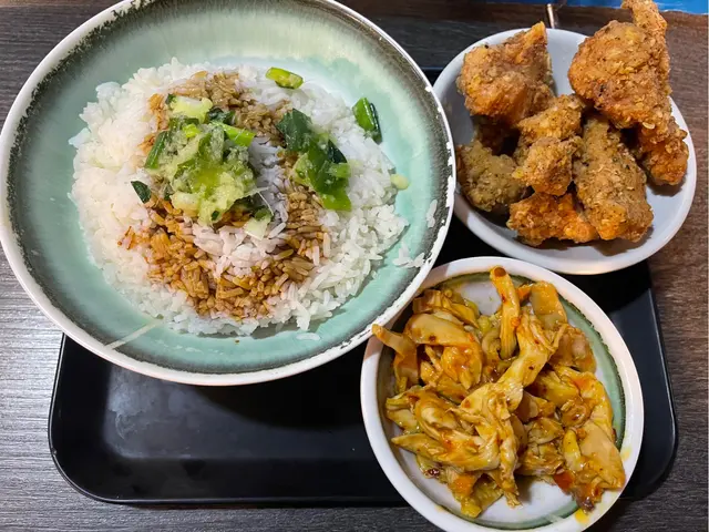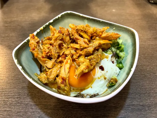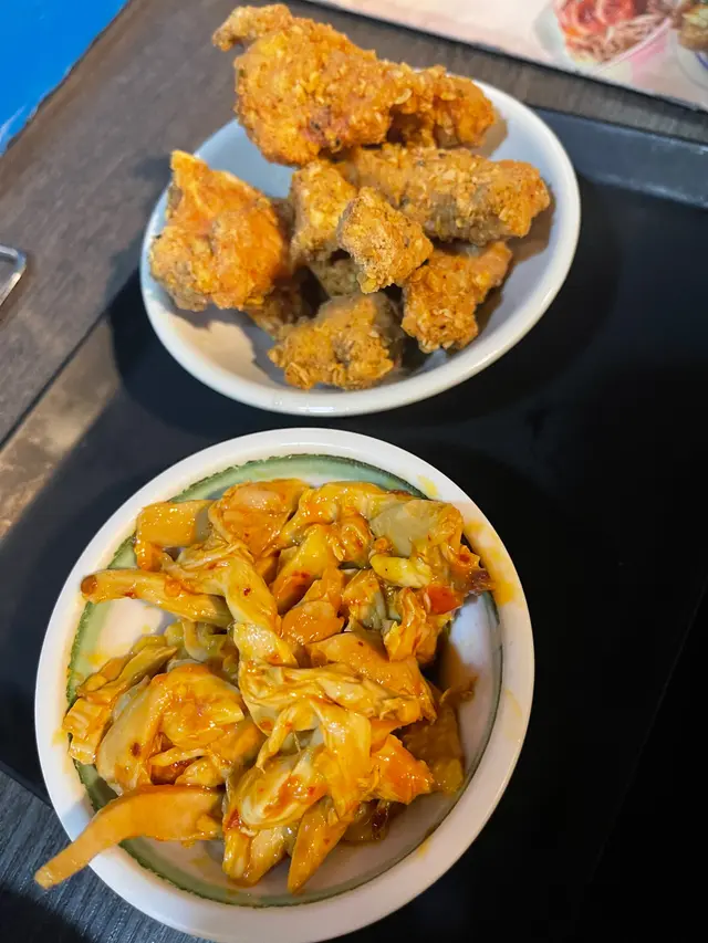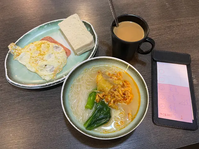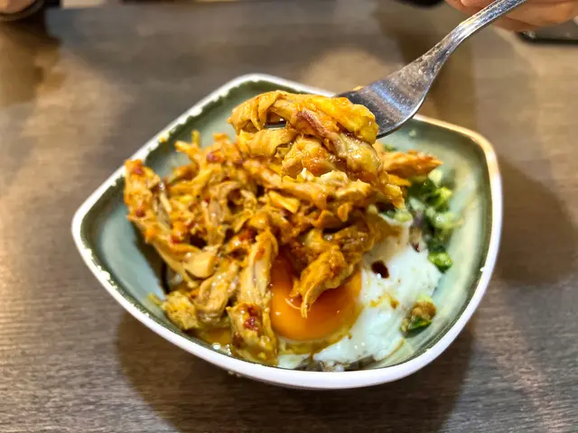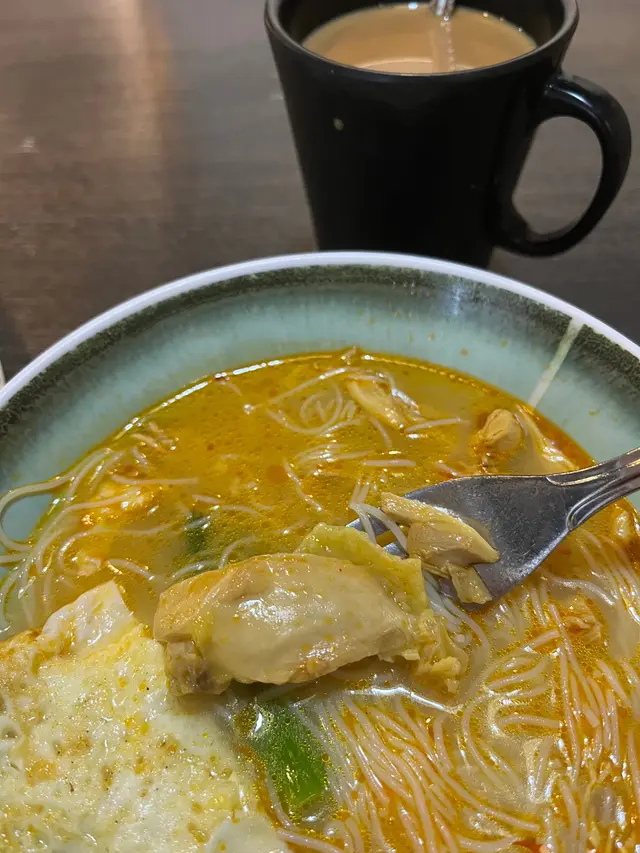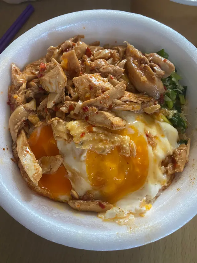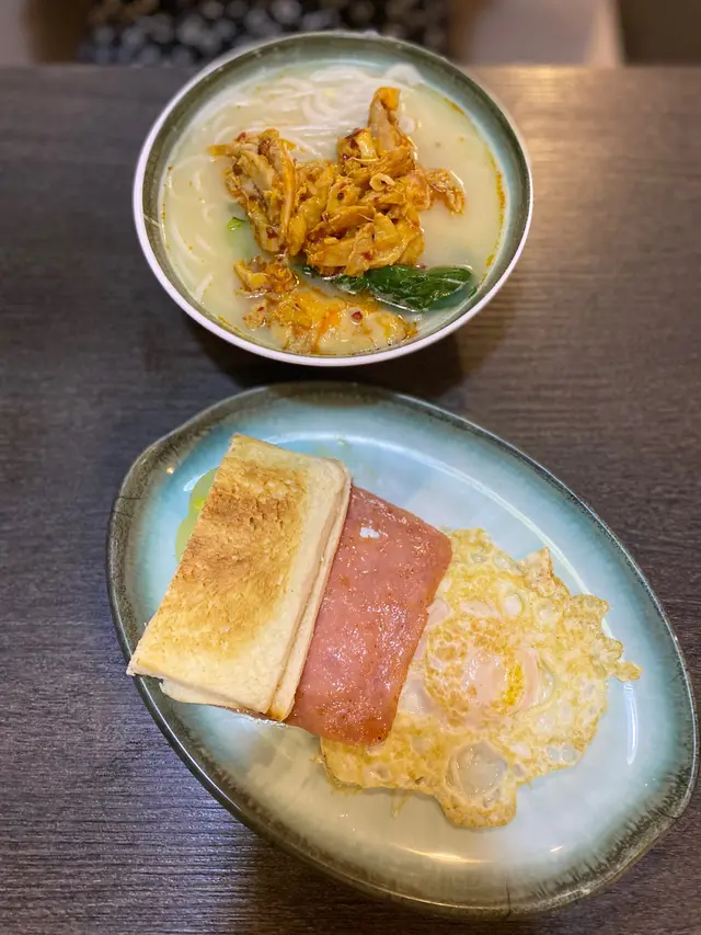 早餐麻辣手撕雞米粉,火腿煎熟蛋,牛油方包