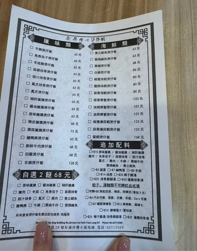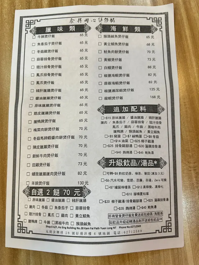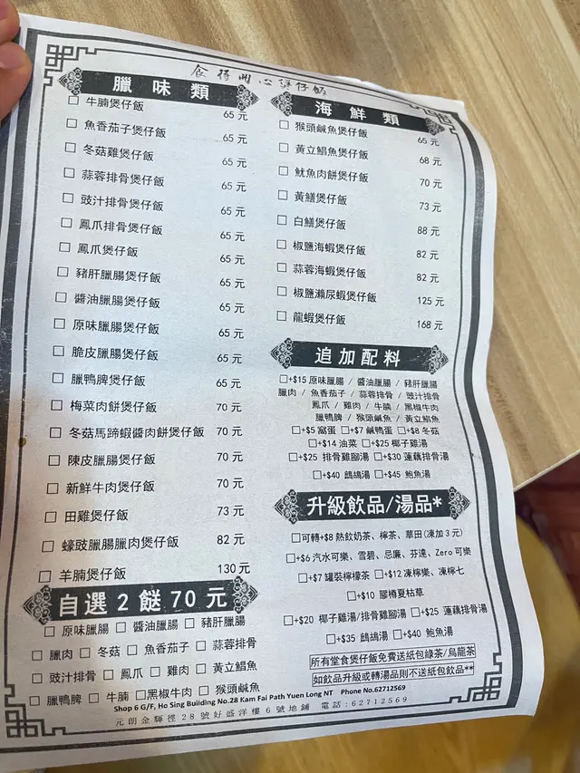 食得開心煲仔飯 (元朗) 網址: https://s.openrice.com/QrbS0sSaB00 地址: 香港元朗金輝徑28號好盛洋樓地下6號舖 電話: +852 62712569